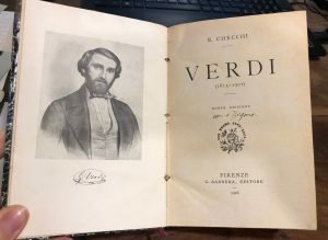 Legatura in mezza tela d'epoca ma non editoriale , etichetta d'epoca al dorso. Ritratto di Verdi all'antip. Alcune riproduz. di partiture originali. Piccolo timbro di vecchio proprietario all'occhiello, per il resto buono. Pagg.244 , mis. 165x110
