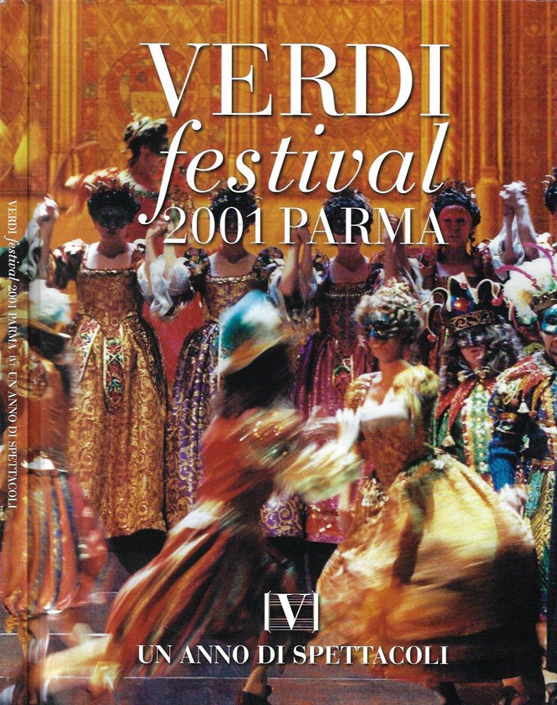 Volume prevalentemente fotografico, testimonianze visive e descrizioni dal festival Verdi 2001 in Parma. Brossura con bandelle oversize, copertina segnata da comuni tracce di attrito e manipolazione, toni impastati e spenti dal tempo, interno conservato in ottimo stato, puliti i tagli. N. pag. 96.