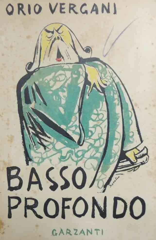 Orio Vergani, Basso profondo ed altre fantasie, illustrazioni di Novello, Garzanti Editore, s.l. (ma stampato a Milano, presso la Tip. S. A. Saita) 1939, seconda ed., pp. 208, ill. col., cm 22, br. ed. Timbro d’appartenenza all’occhiello. Tracce d’uso, fioriture, leggera brunitura della carta, ma nel complesso buona copia.