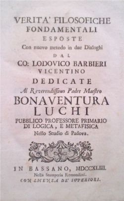 In-8° (cm. 18,3), legatura coeva in cartonato alla rustica con titolo ms. al dorso; pp. [8], 256 in buono stato, in barbe, con qualche trascurabile segno d'uso. Edizione originale e unica, non comune, del Barbieri, nobile poligrafo vicentino che dedica l'opera di taglio illuminista al prof. Bonaventura Luchi. Esemplare molto buono. (NH8)