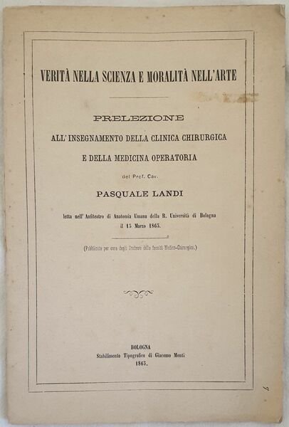 Interessante pubblicazione del 1865, il discorso introduttivo al corso di clinica chirurgica e medicina operatoria nell'Universita di BOlgona tenuto dal chirurgo italiano Pasquale Landi (Porrona 1817-San Benedetto a Settimo 1895). Landi fu medico molto attivo e stimato a Siena Bologna e Pisa. In buone condizioni. Copertina editoriale in buone condizioni generali con lievi usure ai margini e dorso. Legatura in buone condizioni. All'interno le pagine si presentano in buone condizioni con fioriture. Piegatura verticale. Segno di ruggine al margine superiore. In 8. Dim. 24x16 cm. Pp. 16.Interesting pamphlet of 1865, the introductive sppech to the course of surgery medicine in the _University of Bologna held by the italian surgeon Pasquale Landi (Porrona 1817-San Benedetto a Settimo 1895). Landi was a very active and estimated physician in Siena Bologna and Pisa. In good conditions. Editorial cover in good general conditions lightly worn in the extremities. Binding in good conditions. Inside pages are in good conditions with foxing. Vertical folding. Rust sign in the upper edge. In 8. Dim. 24x16 cm. Pp. 16.
