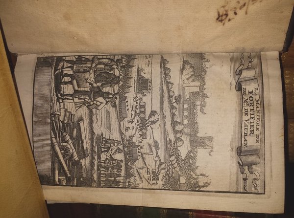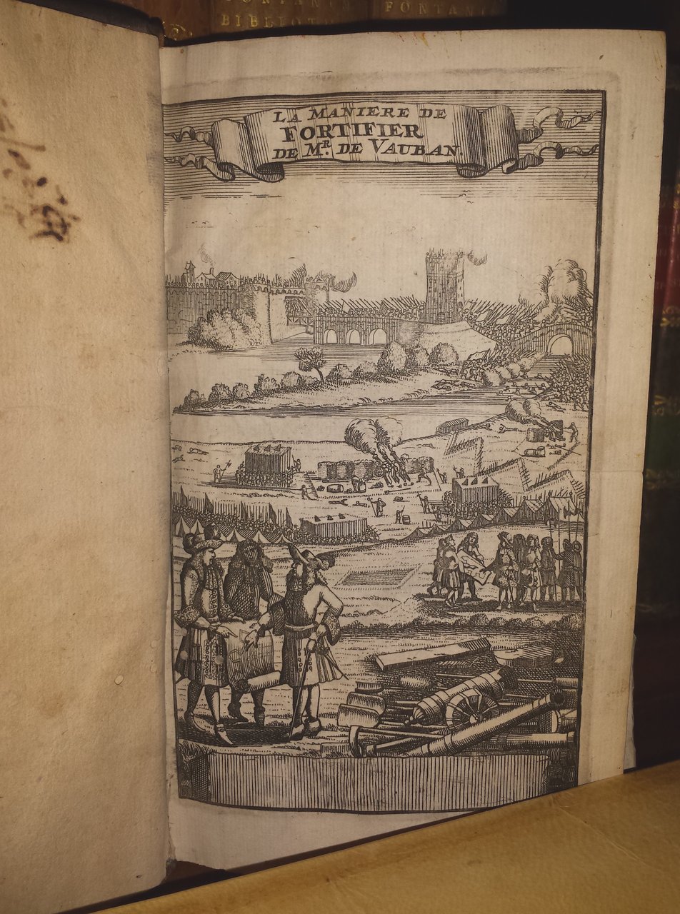 In-8 (19 cm) 2 voll in uno (1) c. (antiporta) 89 (1) c. (di carta ripiegata) (7), 50 (6) 147 (3) (20) c. (di tavole da A a X) 8 c. (tavole). Frontespizi in rosso e nero. Vignetta xilografica uguale su entrambi i frontespizi. Numerose incisioni nel testo tra cui qualche capolettera e finalino. Foretto da tarlo persistente ai margini bianchi interni delle ultime pagine del primo volume e le prime 70 del secondo. Titolo completo "Veritable maniere de bien fortifier de Mr. De Vauban. Ou l'on voit de quelle methode on se sert aujourd'hui en France, pour la Fortification des Places. Le tout mis en ordre par Mr. l'Abbé Du Fay, et le Chevalier de Cambray. Nouvelle Edition corrigee & augmentee de la moitie. Tome premier-second" Bella edizione dell'opera più nota di Sébastien Le Prestre (1633-1707) Marchese di Vauban, il più grande ingegnere militare dei tempi del Re Solo, noto oggigiorno per la grande rete di fortificazione che realizzò per unire le piazzaforti di Dunkerque, Bergues, Furnes, Fort de Kenock, Ypres, Menin, Lille, Tournai, Forte la Montagne, Condé, Valenciennes, Le Quesnoy, Maubeuge, Philippeville e Dinant. Queste fortezze verranno poi messe in comunicazione mediante un sistema di vie d'acqua di interesse militare, ma dalle ovvie potenzialità economiche. Realizzò anche una seconda linea composta anch'essa di 13 luoghi: Gravelines, Saint-Omer, Aire, Béthune, Arras, Douai, Bouchain, Cambrai, Landrecies, Avesnes, Marienbourg, Rocroi et Charleville. French language. Lingua francese. (EN) In-8 (19 cm) 2 voll in one (1) c. (frontispiece) 89 (1) c. (of folded paper) (7), 50 (6) 147 (3) (20) c. (of plates A to X) 8 c. (tables). Title pages in red and black. Same woodcut vignette on both title pages. Numerous engravings in the text including some drop caps and end caps. Persistent woodworm puncture on the internal white margins of the last pages of the first volume and the first 70 of the second. Complete title "Veritable ways of bien fortifier de Mr. De Vauban. Ou l'on voit de quelle methode on se sert aujourd'hui en France, pour la Fortification des Places. Le tout mis en ordre par Mr. l'Abbé Du Fay, et le Chevalier de Cambray. Nouvelle Edition corrigee & augmentee de la moitie. Tome premier-second" Beautiful edition of the best-known work of Sébastien Le Prestre (1633-1707) Marquis of Vauban, the greatest military engineer of the time of the Solo King, known today for the great fortification network he built to unite the strongholds of Dunkirk, Bergues, Furnes, Fort de Kenock, Ypres, Menin, Lille, Tournai, Fort la Montagne, Condé, Valenciennes, Le Quesnoy, Maubeuge, Philippeville and Dinant. These fortresses will then be connected via a system of waterways of military interest, but with obvious economic potential. He also created a second line also made up of 13 places: Gravelines, Saint-Omer, Aire, Béthune, Arras, Douai, Bouchain, Cambrai, Landrecies, Avesnes, Marienbourg, Rocroi and Charleville. French language. Lingua francese