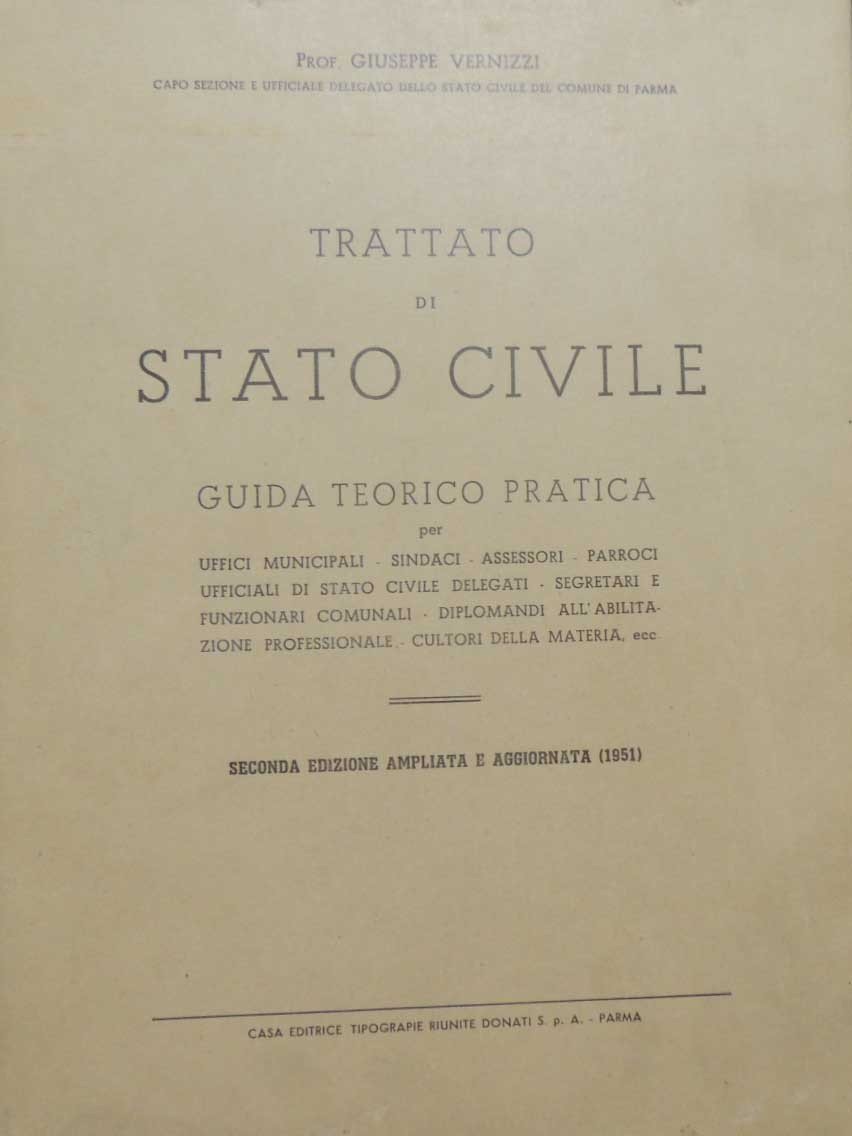 Giuseppe Vernizzi, Trattato di Stato Civile. Guida teorico pratica per uffici municipali, sindaci, assessori, parroci, ufficiali di stato civile delegati, segretari e funzionari comunali, diplomandi all’abilitazione professionale, cultori della materia ecc., Casa Editrice Tipografie Riunite Donati S.p.A., Parma 1951, seconda ed. ampliata e aggiornata, pp. XXVII, 804, cm 25, legatura in tela ed. con titoli al dorso e al piatto e sovraccoperta. Copia n. 1314. Leggere tracce d’uso alla sovraccoperta, con qualche sgualcitura e uno strappetto senza mancanze, minime fioriture, lieve brunitura della carta, per il resto molto ben conservato.