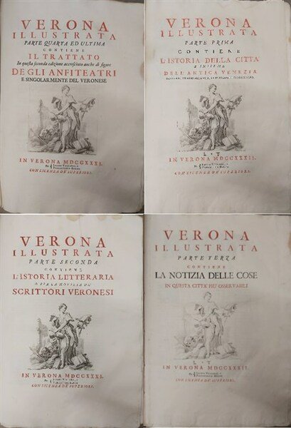 4 parti in 2 voll. in folio, pp. XII, col. 396; X, col. 298; IV, col. 294, (6) ; (4), col. 214, (6), leg. cart. rust. coevo con tit. mss ai d. Tomo I: l’Historia della città, con pianta di Verona e 9 tavv. epigrafiche; tomo II: l’Historia litteraria, con recto e verso di 14 medaglie inc. in rame; tomo III: Notizie sulle cose di questa città più osservabili, con 28 incis. n.t.; tomo IV: Trattato degli anfiteatri, con 18 incis. n.t. Prima ediz. di quest’opera di sommo interesse per la storia della città di Verona. Lozzi 6300. Platneriana p. 426. La leg. coeva in cartone alla rustica presenta tracce d’uso. Belliss. esempl. a larghi margini.