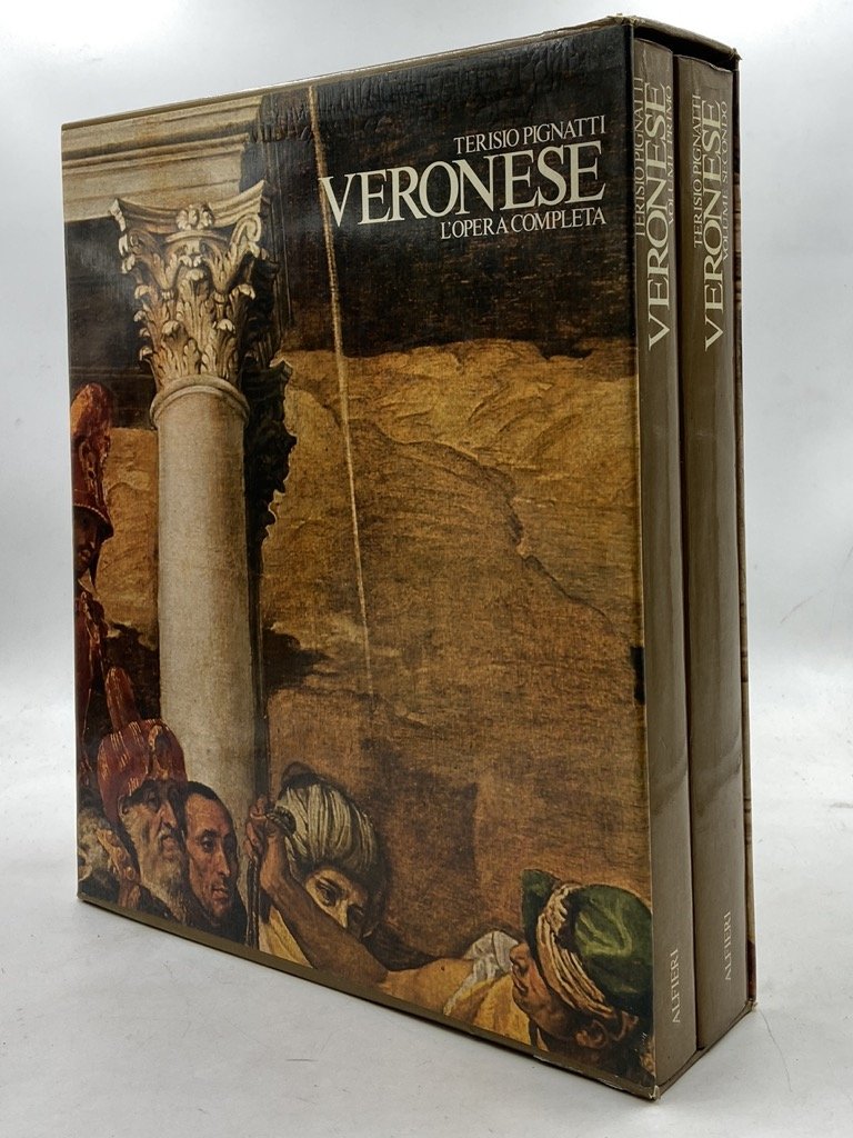 Due volumi in tela con sovraccoperta e cofanetto illustrato, cm 29x25. Volume primo: Testo e cataloghi con 24 tavole a colori, pp 419 (1). Volume secondo: Tavole in nero, circa 500 pagine non numerate, con 1079 illustrazioni in nero. Corposo catalogo dell’opera di Paolo Veronese, che censisce 343 opere giudicate autografe, 421 attribuite, 764 opere perdute, con riproduzione delle fonti manoscritte o a stampa; con regesto dei documenti e bibliografia.