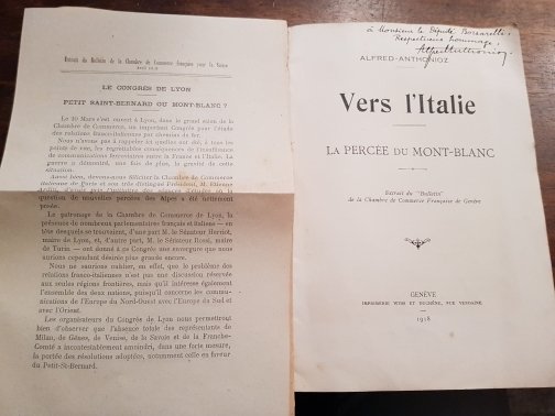 In-8°, pp. 23, brossura editoriale. Dedica autografa dell'autore. Inserio dentro un bifoglio dal titolo Le congres de Lyon. Petit Saint-Bernard ou Mont-Blanc?
