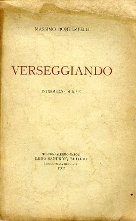 In-8°, pp. 38, (4), brossura editoriale. Dedica a stampa alla Marchesa Bice D'Adda Trotti. Dedica autografa di Bontempelli a Domenico Oliva (Torino, 1860-Genova, 1917), noto giornalista (diresse anche il 'Corriere della Sera'), uomo politico, critico letterario e librettista (collaborò al libretto della pucciniana 'Manon Lescaut'): 'A Domenico Oliva ricordando e salutando Maddaloni (posta) 9 maggio 1905 Massimo Bontempelli'. Aloni alla brossura e reintegrazioni al margine superiore del piatto. Quasi interamene a fogli chiusi, con ingialliture della carta. Prima edizione, rara. La raccolta comprende 4 liriche, poi rifiutate dall'autore. 'Già in questa primissima fase della sua attività abbondante è la produzione narrativa e poetica del Bontempelli, espressa nella pubblicazione di numerose raccolte di liriche e di racconti. Tale produzione è contraddistinta dal segno di una forte fedeltà alla tradizione letteraria degli ultimi decenni dell'Ottocento. Ciò è particolarmente evidente nei suoi esperimenti di poesia, di stretta osservanza carducciana.' (Alberto Asor Rosa in D.B.I., XII, 1971). Gambetti / Vezzosi, p. 120: 'Abbastanza raro e molto ricercato'. Spaducci, p. 54.
