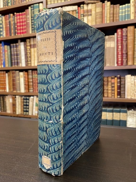 <span style="font-style: normal;">3 volumi in 1 in-8° (cm. 22,7), legatura coeva in cartonato marmorizzato con titolo a stampa su tassello al dorso (leggermente stanca); pp. [20] 106 [2b], [12] 99 [1b]; [12] 118 [2b]; in barbe e in ottimo stato. Due opere in t</span>iratura speciale di pochi esemplari su carta real fina di Napoli in barbe (filigrana: trifoglio e iniziali EP). I<span style="font-style: normal;"> </span><i style="font-style: normal;">Versi </i>sono in terza edizione e contengono, per la prima volta in raccolta, l’'ode <i>Al Signor di Montgolfier</i> e la canzonetta <i>La fecondità </i>(apparse rispettivamente nel 1784 e 1786) nonché, in edizione originale, la canzonetta <i>Amor vergognoso</i>. L'<i>Aristodemo</i> è in seconda edizione e si differenzia dalla tiratura ordinaria per le variazioni di composizione a p. 84 (18 linee di testo invece di 19; linee 12-13: ARISTODEMO uscendo impetuosamente e cadendo / sul davanti del Teatro fuori di sentimento.); a p. 113 (seconda e terza linea: ARISTODEMO, ARGIA indi GONIPPO, / ed EUMEO.); alla linee 14 di p. 114 e alla linea 13 di p. 115: Figlia (invece di figlia). Cfr. Brooks 331-332. Esemplare molto buono. (SJ5)
