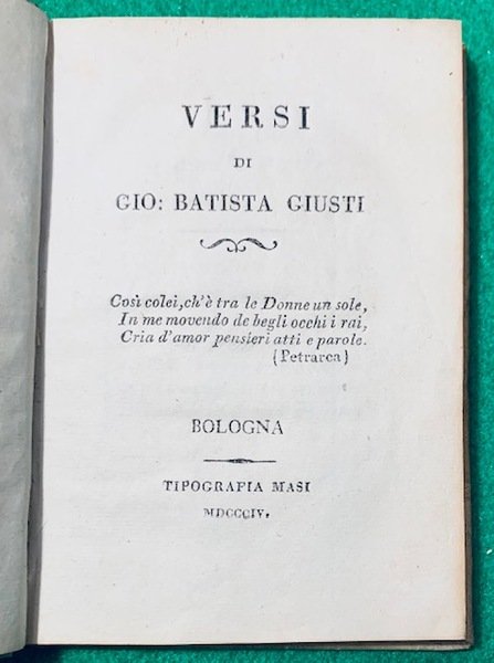 In 12°; (4), XVI, 68 pp. Legatura in piena pergamena (qualche forellino di tarlo). Un tarletto al margine interno bianco delle ultime due carte, ininfluente. Tagli spruzzati in rosso. Stampa su carta azzurrina. In buone-ottime condizioni di conservazione. Seconda edizione, dopo la prima bodoniana del 1801 (tirata in due formati differenti) e ben più rara di quella, di questa raccolta di versi dell'ingegnere, traduttore e poeta lucchese, Giambattista Giusti (Lucca, 1758 Bologna, 1829). Di questa edizione su carta azzurra devono essere state tirate pochissimi esemplari, dato che nessun esemplare è censito in ICCU. L'autore, noto ingegnere che lavorò a Bologna, divenne celebre per la sua cultura e per le sue traduzioni dei classici latini e greci. Una delle sue più celebri traduzioni è l'Edipo a Colono di Sofocle, per la quale Gioachino Rossini nel 1817, scrisse le musiche di scena. Molto raro.