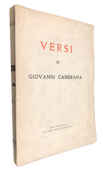 In-8°, pp. (24),178,(2), pp. (24), 178, (2) + un ritratto (medaglione del Camerana in basso rilievo modellato da Bistolfi) + 32 PAESAGGI - disegni al carboncino in bianco e nero fuori testo impressi su carta speciale da cliché NEBIOLO e protetti da velina. Esemplare INTONSO, compatto e integro, lievissime ombre alla bianca copertina con sobrio titolo in nero al dorso e in rosso e nero al piatto. Interno immacolato. Distinta veste tipografica ad ampi margini su carta di pregio nelle sue barbe. Tra i paesaggi, perlopiù prealpini: OROPA, Pollone Morozzo, Moncenisio, Brunnen, Fribourg, Chatillon, Cervino, Montanera, San Front. La sua poesia è spesso ispirata da paesaggi. Segnaliamo le poesie per Giuseppe Giacosa, sui quadri di DELLEANI, sl BIELLESE (Val d'Andorno, le 19 OROPEE esprimenti "un desiderio frustrato di salvezza, di abbandono alla fede") o poesie di torbida sensualità (per es. "La Femme"), o tenebrose ("Le Madri"). CAMERANA, tra i massimi esponenti del Scapigliatura, magistrato; non volle pubblicare i suoi versi che uscirono postumi (dopo il suo suicidio del 2 luglio 1905) in due raccolte, cioè questa, "Versi" del 1907, e "Poesie" del 1956 e poi del 1968.