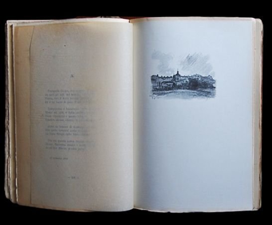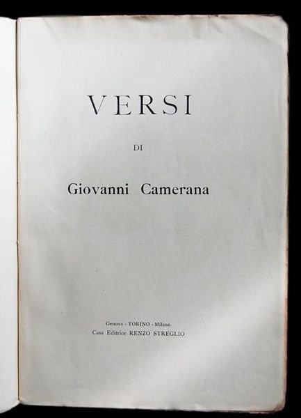 23,5x16,3 cm; 178, (2) pp. e 33 c. di tav. con la riproduzione di vari disegni dell'autore. Brossura editoriale con titolo impresso in rosso e nero al piatto anteriore. Ex-Libris "Prof. Avv.P.P. e M. T. Zanzucchi" applicato alla prima carta bianca. Prima edizione in buone-ottime condizioni di conservazione di questa raccolta postuma di componimenti del grande poeta "Scapigliato" originario di Casale Monferrato, Giovanni Camerana. Questa prima edizione, stampata su carta di ottima qualità fu curata dal grande amico di Camerana, Leonardo Bistolfi. L'opera è composta delle poesie inedite di Camerana raccolte fra le carte dell'amico da Bistolfi dopo che l'autore si era suicidato. "Camerana rappresenta l'anello di congiunzione tra la cosiddetta scapigliatura ed il decadentismo. La sua poesia è stata considerata da molti critici anticipatrice di alcune fra le più importanti esperienze letterarie del primo Novecento, dai Crepuscolari a Dino Campana, fino ad alcune espressioni che al lettore moderno possono ricordare il Montale degli Ossi di seppia". Prima edizione ancora in barbe. Parenti, Prime ediz. ital., p. 117.