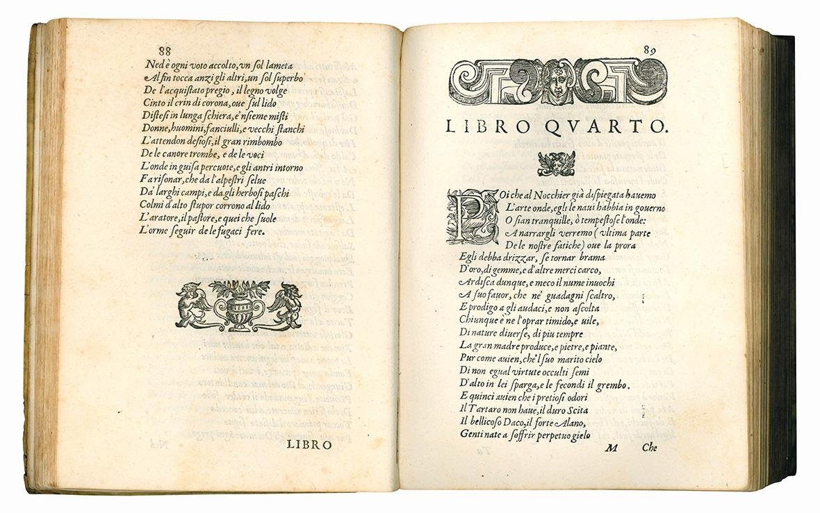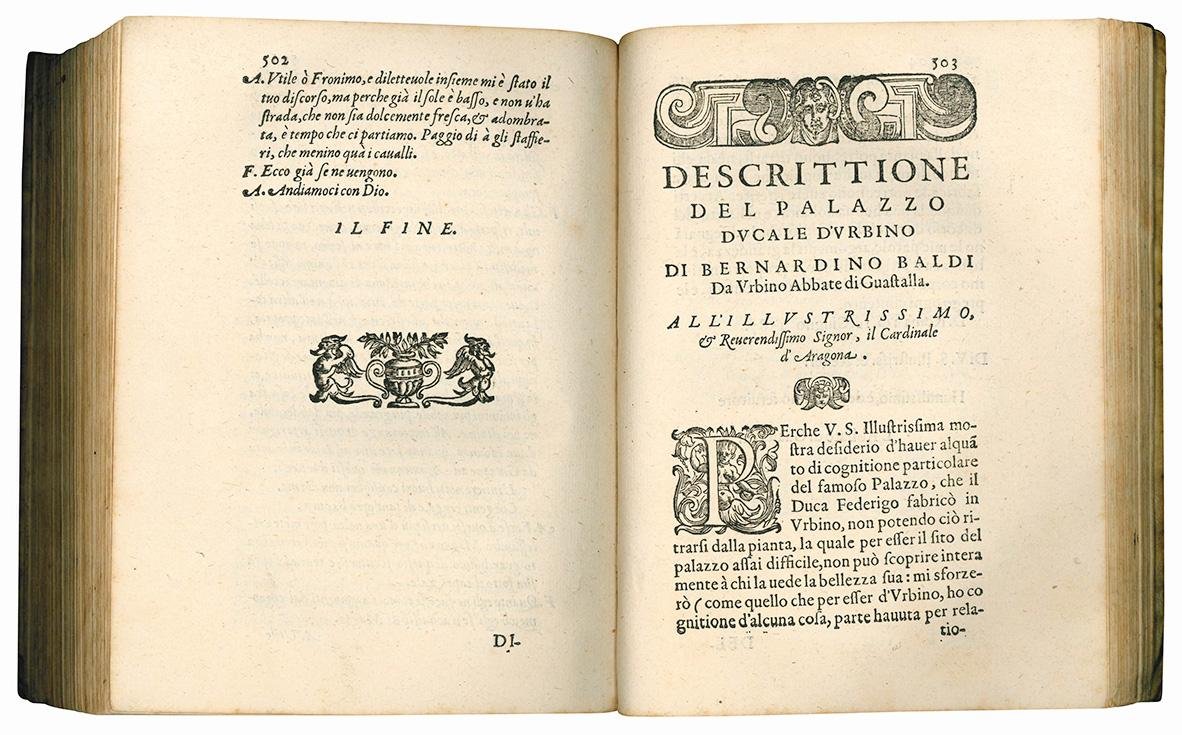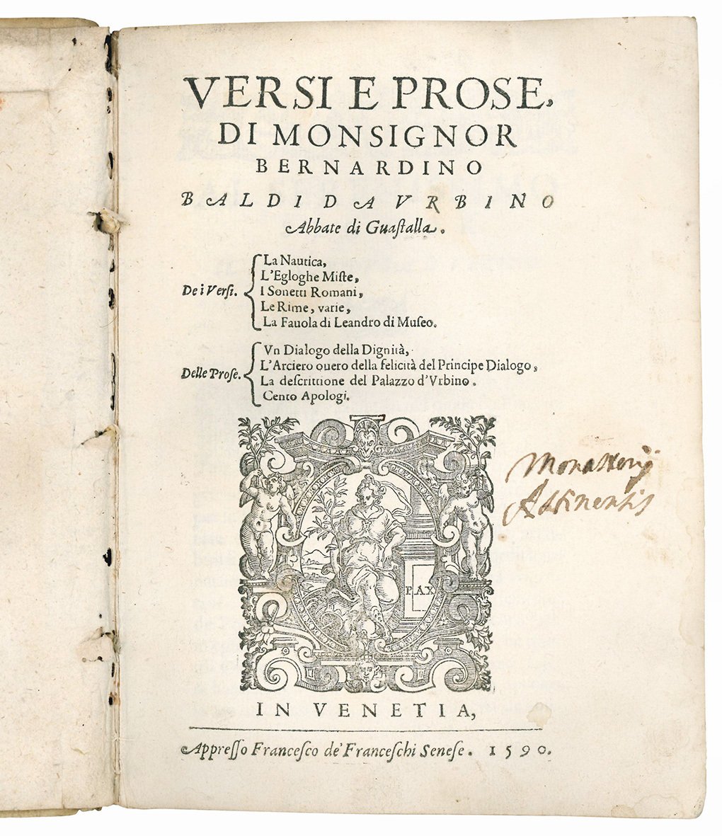First edition of Baldi's collected literary works dedicated to Francesco Maria II della Rovere, Duke of Urbino. The volume opens with a long didactic poem, La Nautica, which is dedicated to Ferrando Gonzaga, Prince of Molfetta. It has some preliminary verses addressed to Baldi and with his answers (e.g., by Torquato Tasso, Giuliano Goselini, Muzio Manfredi, Stefano Guazzo, and many others). The work, in four books (pp. 23-1159), condenses most of the knowledge about the art of navigation of the time, including ship building, astronomical, meteorological and geographical notions (cf. G. Zaccagnini, Le fonti della ‘Nautica' di Bernardino Baldi, in; “Giornale storico della letteratura italiana, 40, 1902, pp. 366-396; see also C. Spalanca, ‘La nautica' di Bernardino Baldi fra scienza e letteratura, in: “Letteratura e scienza nella storia della cultura italiana”, V. Branca, ed., Palermo, 1978, pp. 452-464).