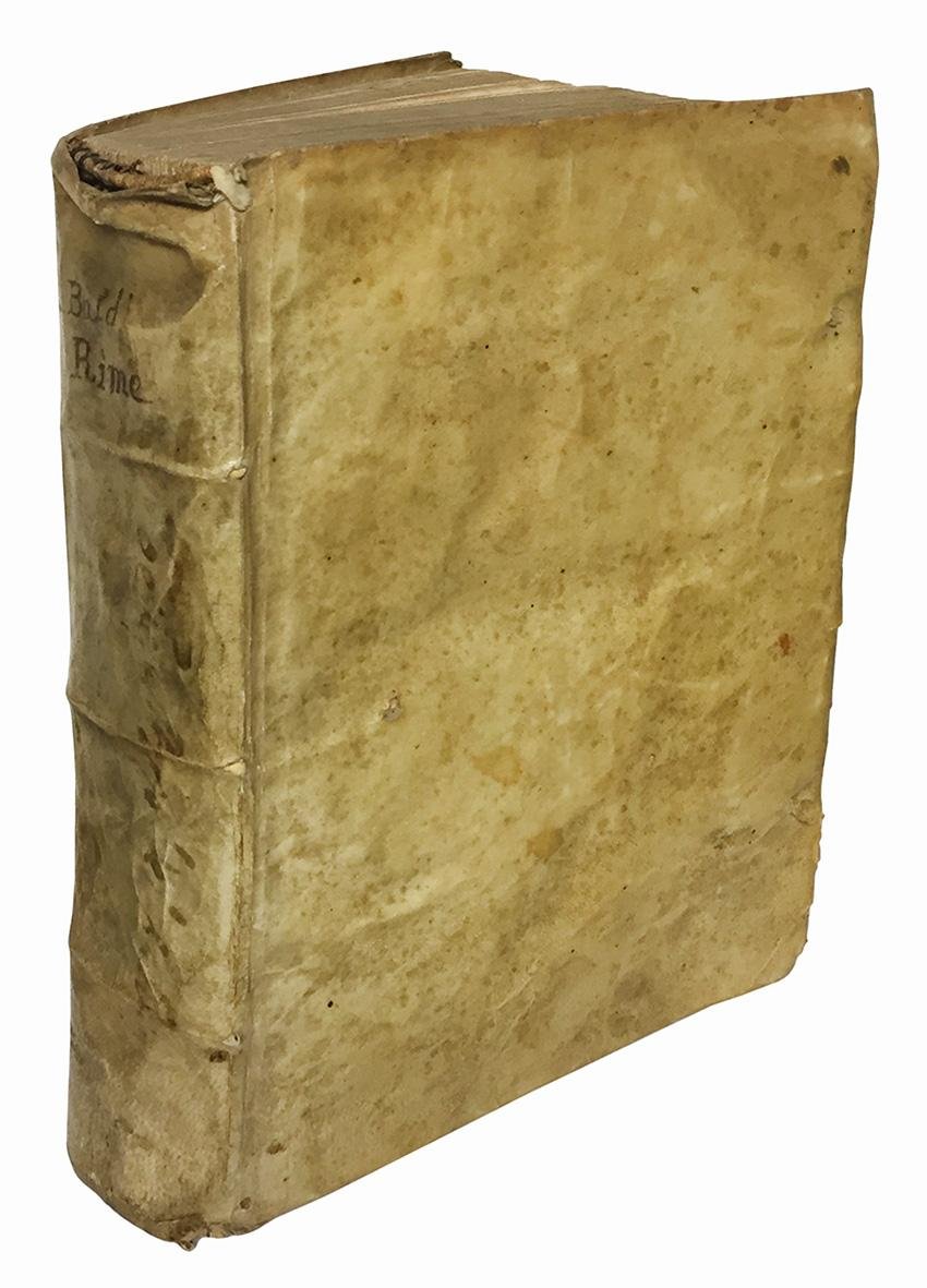 4to (218x157 mm). [12], 9-118, [4], 119-614, [2] pp. Collation: a6 B-O4 P4+2 Q-Z4 Aa-Zz4 Aaa-Zzz4 Aaaa-Hhhh4. Printer's device on title page. Woodcut head- and tailpieces. Contemporary limp vellum with inked title on spine (sightly soiled and stained, traces of ties). On the front pastedown bookplate of Count Giacomo Manzoni (1816-1889, cf. Catalogue de la Bibliothèque du feu M. Le Comte Jacques Manzoni, première partie, Città di Castello, 1892, p. 10, no. 94), on title page old manuscript ownership's entry “Monasterii Astinesis”. Light browning and staining, a few gathering more heavily browned, a very good, genuine copy.
