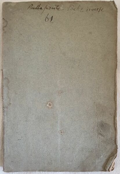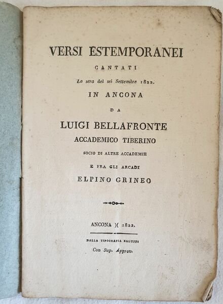 Edizione del 1822 di questa raccolta di versi di Luigi Bellafronte accademico tiberino recitati la sera del 6 settembre 1822 in Ancona. In mediocri condizioni. Copertina morbida coeva in buone condizioni con lievi usure. Legatura in buone condizioni. Pagine in buone condizioni con rare fioriture. Mancanza a pag. 5 con perdita di testo. In 8. cm 20,5x14. Pp. 19+(1). Edition of 1822 of this collection of verses by Luigi Bellafronte told the 6th of september 1822 in Ancona. In poor conditions. Soft coeval cover in good conditions lightly worn in the extremities. Binding in good conditions. Inside pages are in good conditions with occasional foxing. Lackings in pag. 5 with loss of text. In 8. cm 20,5x14. Pp. 19+(1).