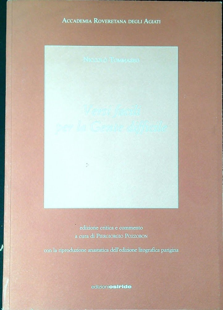 Tommaseo, Niccolò; P. Pozzabon (a cura di) Versi facili per la gente difficile. Rovereto, Osiride 2002, 24 281 p. 281 p. : 1 ritr. ; 24 cm (62876)