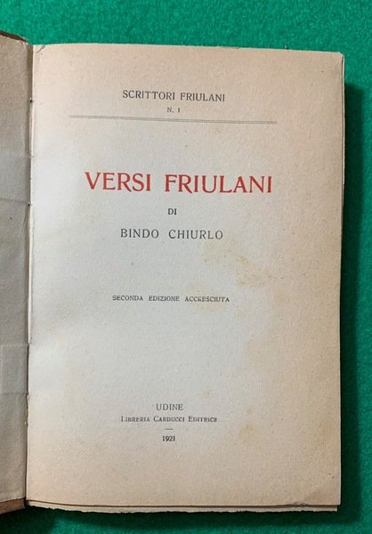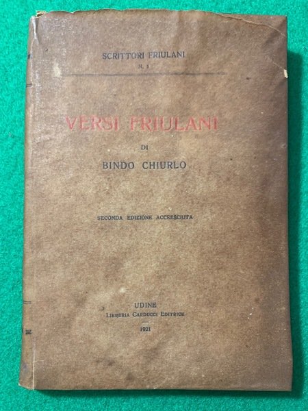 In 8°; VIII, 117, (1) pp. Legatura editoriale in carta pergamena con titolo in rosso e nero al piatto anteriore. Seconda edizione, accresciuta notevolmente, di questa raccolta di componimenti in dialetto friulano, del noto poeta e critico letterario, Bindo Chiurlo (Cassacco, 13 ottobre 1886 - Torino, 24 dicembre 1943). Esemplare in buone-ottime condizioni di conservazione.