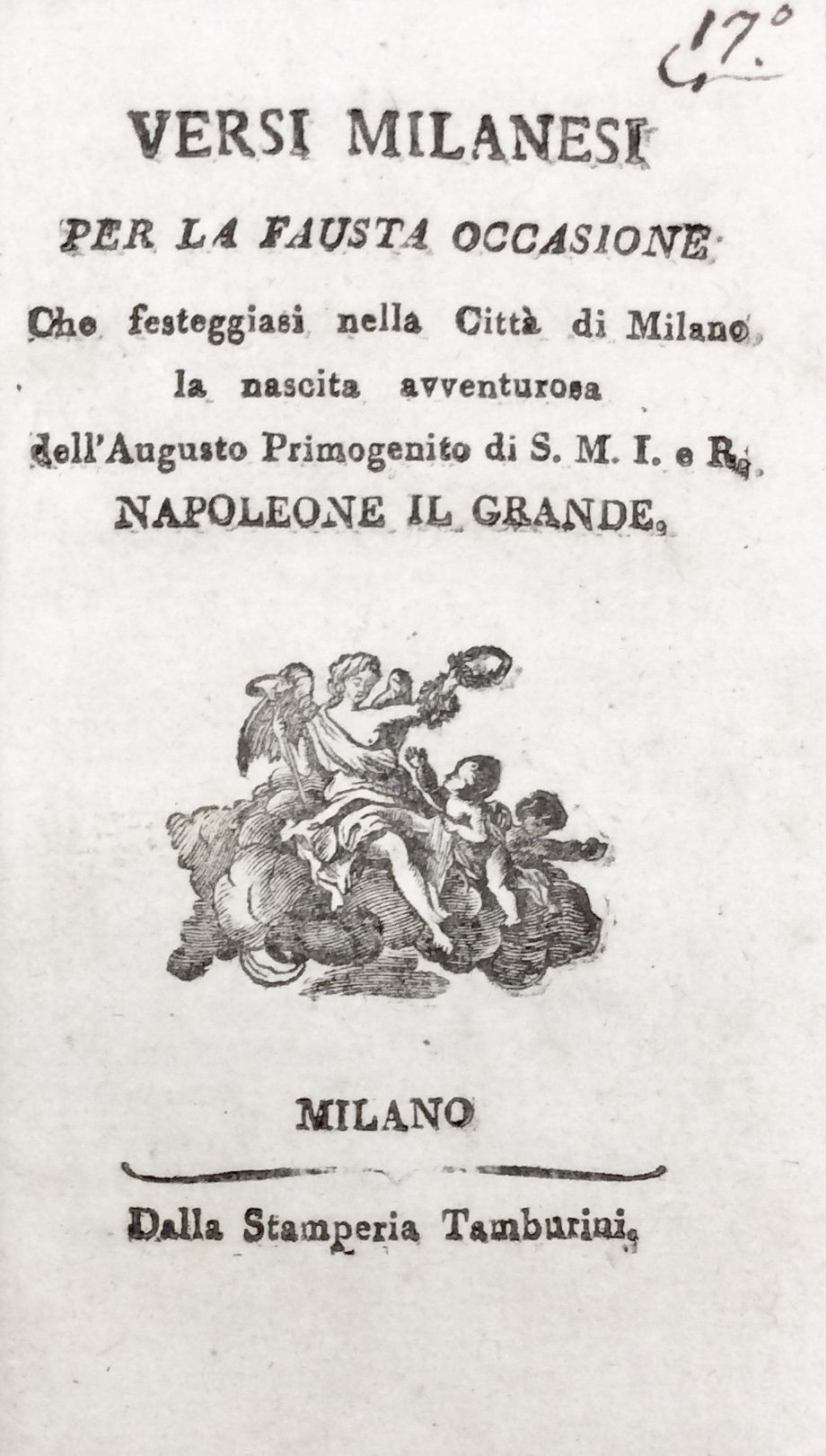 VERSI MILANESI PER LA FAUSTA OCCASIONE CHE FESTEGGIASI NELLA CITTA' DI MILANO LA NASCITA AVVENTUROSA DELL'AUGUSTO PRIMOGENITO DI S.M.I. E R. NAPOLEONE IL GRANDE.