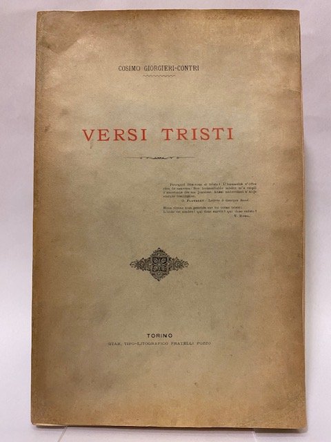 Brossura editoriale, dorso sapientemente restaurato, ottima copia dell’opera prima del poeta lucchese Giorgieri-Contri. Cfr. Gambetti Vezzosi, 1023: “Molto raro e ricercato”.