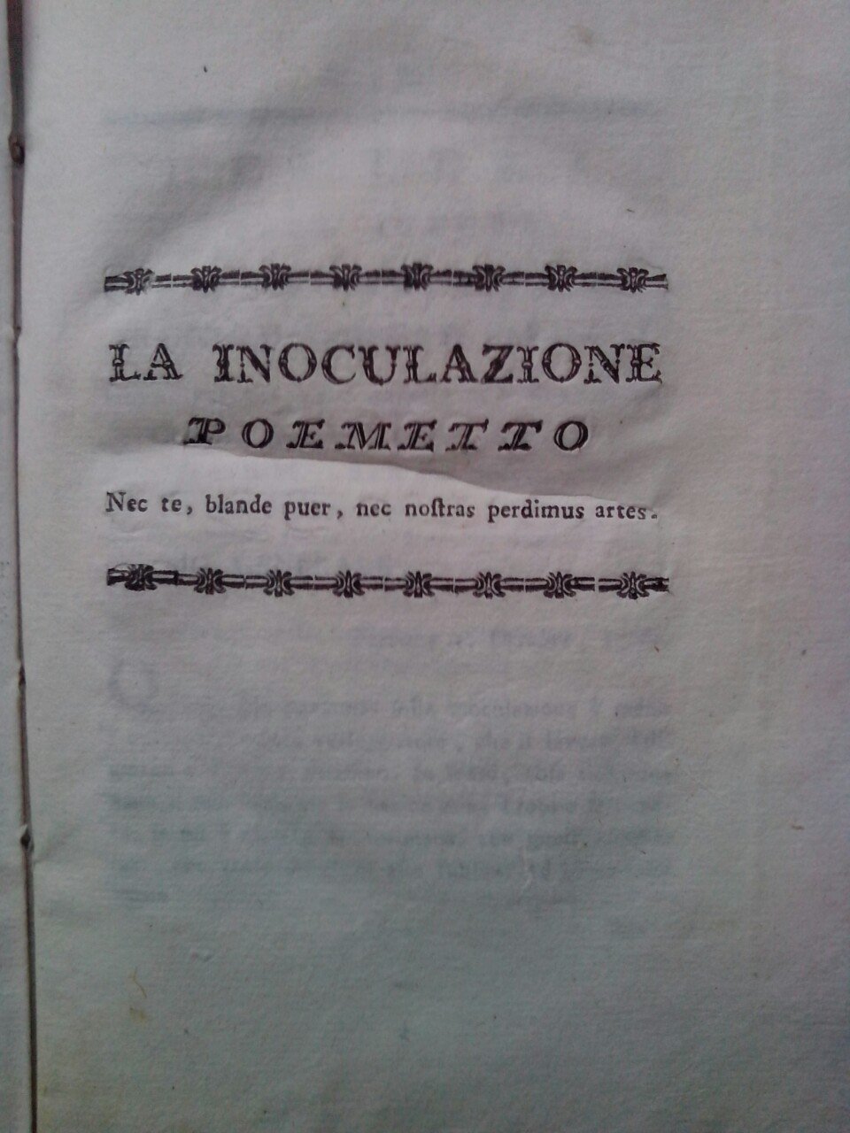 Prima edizione della raccolta. In 8° , p. VIII,206,cb. Al frontespizio bella cornice ornamentale con strumenti musicali, cornucopie e la musa Clio. L'autore ebbe un ruolo politico durante la Repubblica Cisalpina. L'opera che gli diede la fama è il primo poemetto qui pubblicato, "La inoculazione", che descrive i primi esperimenti italiani di inoculazione del vaiolo. Ottimo esemplare con barbe. Legatura coeva in cartoncino "alla rustica".