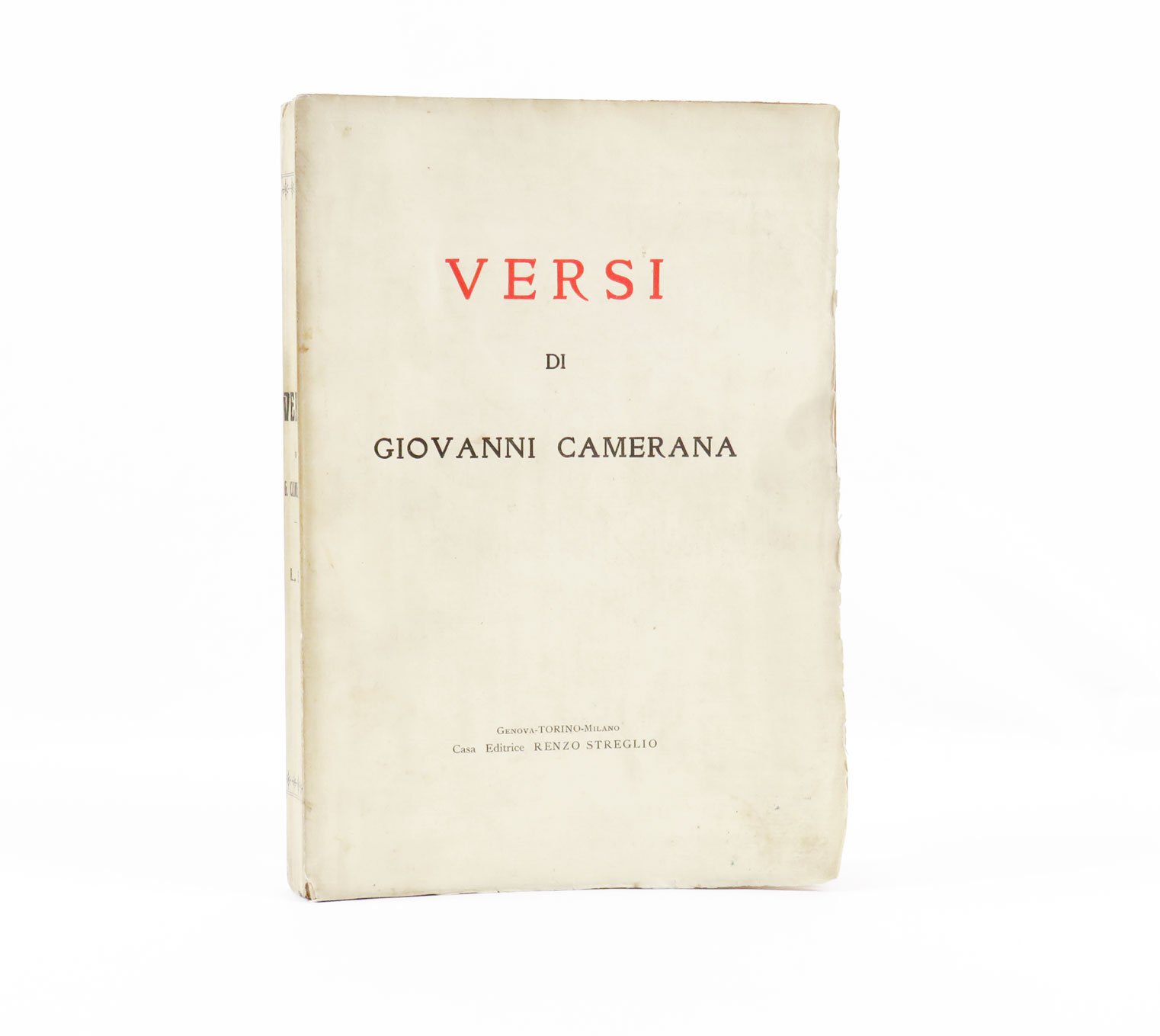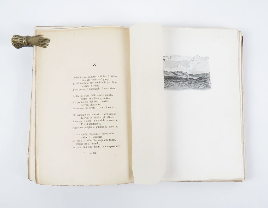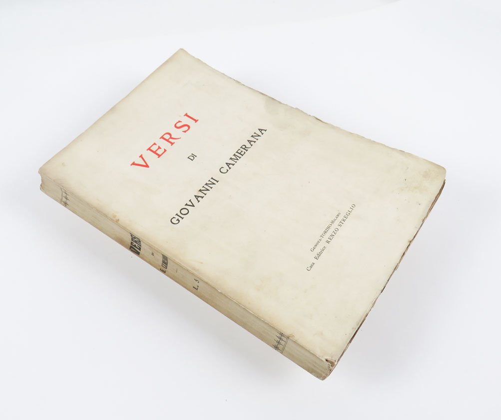 LIBROPrima edizione.Ottimo esemplare. Timbretto ex libris Antonio Teofili al frontespizio.Prima raccolta poetica di Giovanni Camerana, «pubblicata postuma e curata dagli amici — Leonardo Bistolfi che ne fu anche il prefatore, e Francesco Pastonchi — apparsa a Torino presso l’editore Streglio nel 1907» (Camerana, Poesie, a c. di G. Finzi, p. XXXIII). Per quanto i criteri che portarono i curatori alla scelta dei componimenti e alla loro disposizione non siano esplicitati, l’edizione fu un passaggio fondamentale nella circolazione della produzione poetica di Camerana, riferimento obbligato anche per tutte le edizioni successive. -- Il volume raccoglie sia poesie inedite sia componimenti editi nelle più importanti riviste del tempo (tra cui la «Rivista contemporanea» e la «Rivista minima»; si veda Ricorda, La poesia di Camerana e la negatività del reale, p. 61). Oltre che per la sua produzione poetica, Camerana fu apprezzato come pittore e disegnatore: nell’allestimento della raccolta, gli amici dell’autore decisero di accompagnare le poesie con numerose tavole disegnate dallo stesso Camerana, «un necessario complemento ai componimenti [.], riescono a farci comprendere quale artista fosse» (da «Nuova Antologia di lettere, scienze ed arti», 1907, vol. 22, p. 179). -- Camerana fu una figura singolare nell’ambiente scapigliato, una sorta di “outsider”: «Il “poeta della castità”, così lo definiva il contemporaneo Remigio Zena nell’unico vero saggio, vivente Camerana, dove venivano individuate alcune costanti di questa poesia: il “paesaggismo d’istinto”; “l’intuizione tormentosa del mondo astratto congiunta alla netta percezione del mondo reale”; un certo “misticismo. pizzicante di nordico e di medievale, ispirato dal terzo libro dell’Imitazione di Cristo”» (Camerana, Poesie, a c. di G. Finzi, p. XIX).Parenti, Rarità Bibl., V, p. 61; G. Finzi (a cura di), G.Camerana, «Poesie», Einaudi, Torino 1968, pp. XIX-XXXIII; Ricorda, «La poesia di Camerana e la negatività del reale» in «Scapigliatura e dintorni», Milano, 1992, p. 61