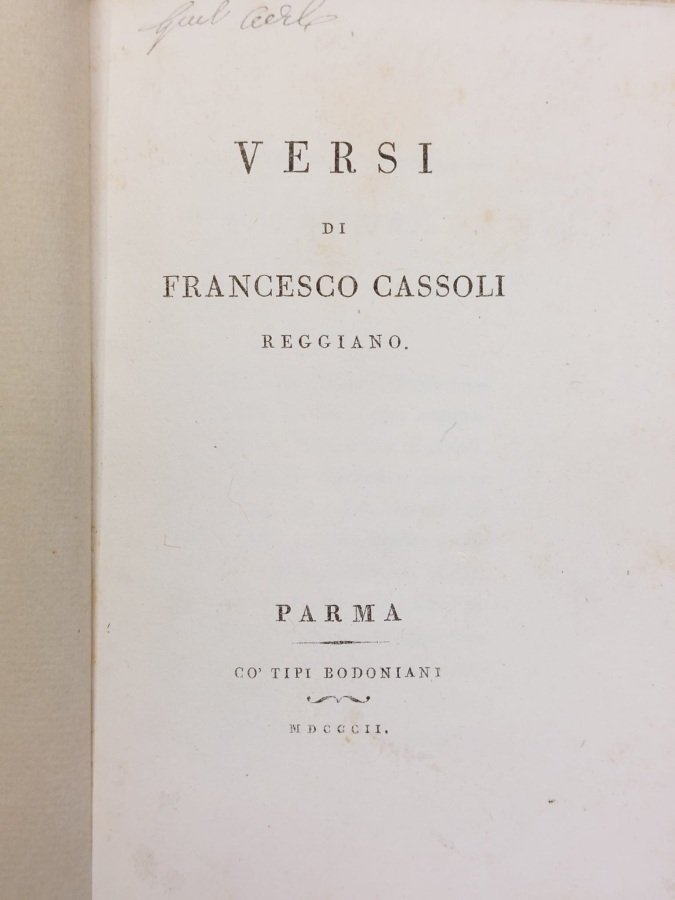 In-8° (cm. 16), legatura moderna in cartonato muto; pp. [6] 54 [2] in barbe, in stato molto buono (lievi fioriture); antica firma al margine del frontespizio. Prima elegante edizione dei versi del poeta reggiano. Cfr. Brooks 151, n. 872; De Lama II, 151. Buon esemplare. (NG5)