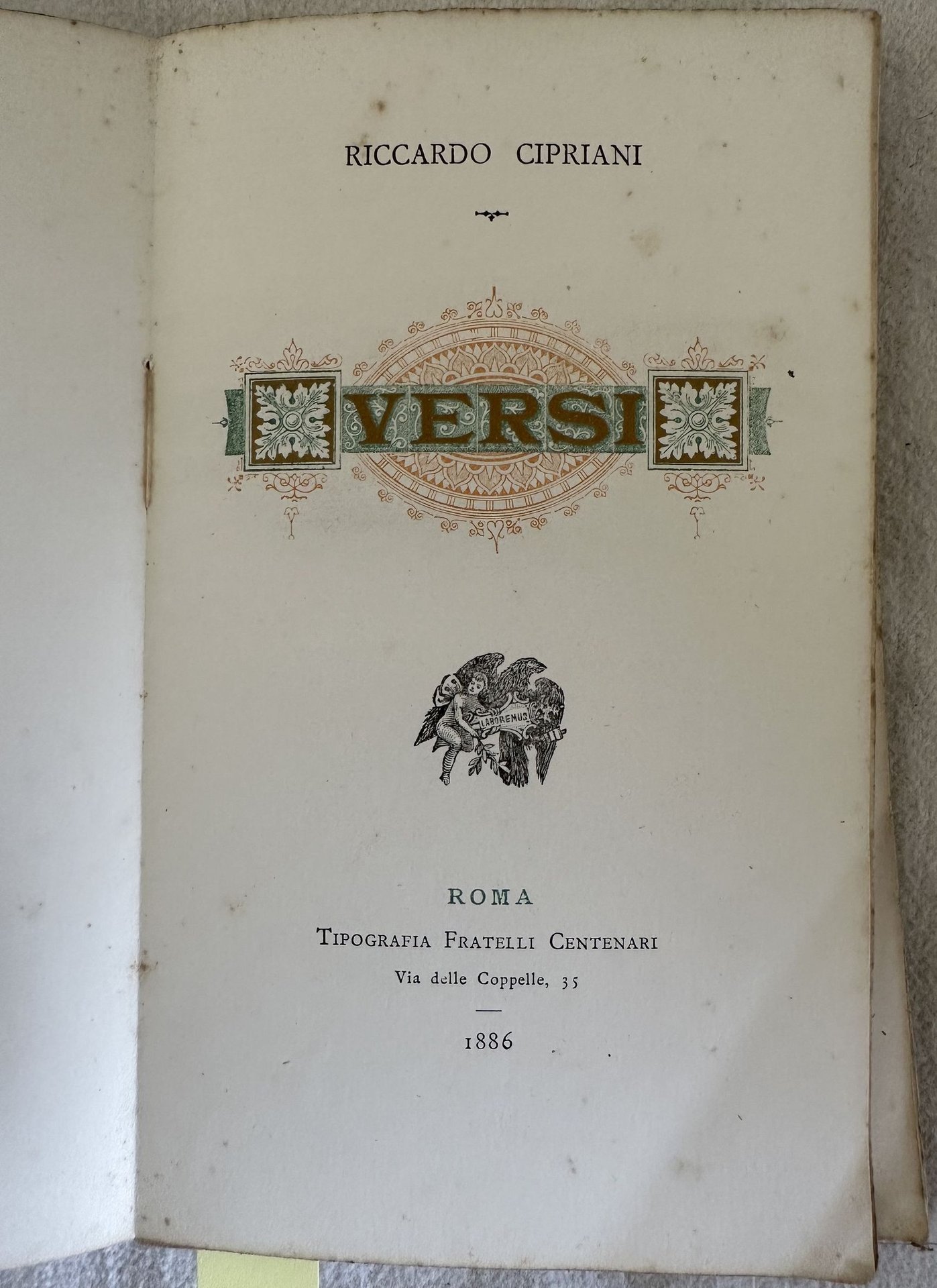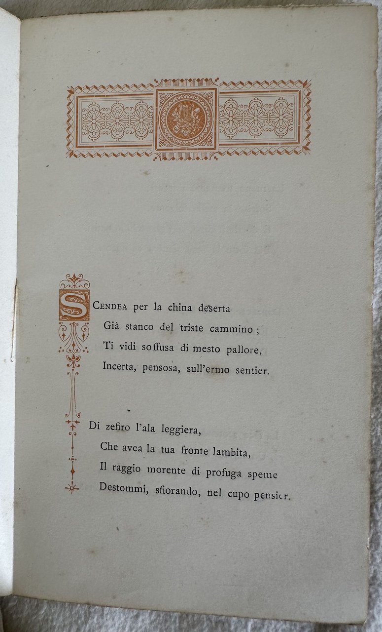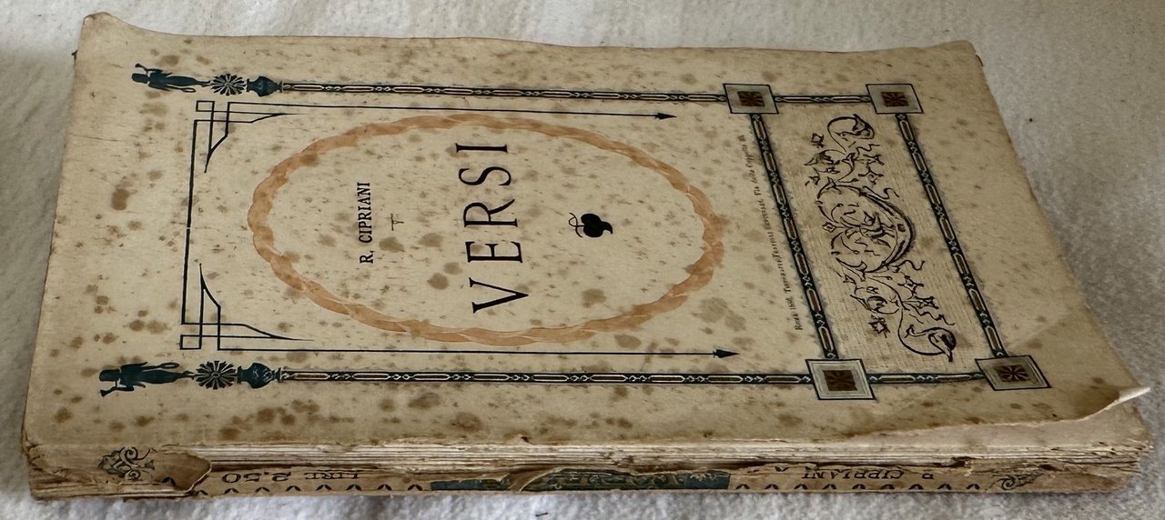 Probabile prima edizione del 1886 di questa raccolta di versi di Riccardo Cipriani. Frontespizio a colori. Un poema sul Poggio Reale di Napoli. Dal colophon: "Stampato in Roma nella tipografia FRatelli centenari con caratteri e fregi della fonderia Rayper di Genova sopra carta della ditta Malfioretti di Milano e con inchiostri di propria fabbricazione in edizione di copie 1000". In discrete condizioni. Copertina editoriale in discrete condizioni generali con usure ai margini e dorso. Mancanze al dorso e piatto anteriore staccato. Legatura in discrete condizioni con rotture. Pagine in buone condizioni con rare fioriture. In 16. cm. 17x10,5. Pp. 102+(10). Probable first edition of 1886 of this collection of verses by Riccardo Cipriani. Coloured title page. A poem about Poggio Reale in Naples From colophon: "Stampato in Roma nella tipografia FRatelli centenari con caratteri e fregi della fonderia Rayper di Genova sopra carta della ditta Malfioretti di Milano e con inchiostri di propria fabbricazione in edizione di copie 1000". In fair conditions. Editorial cover in fair conditions lightly worn in the extremities. Lackings in the spine and front plate is detached. Binding in fair conditions with cracks. Pages in good conditions with occasional foxing. In 16. cm. 17x10,5. Pp. 102+(10).