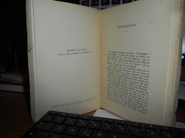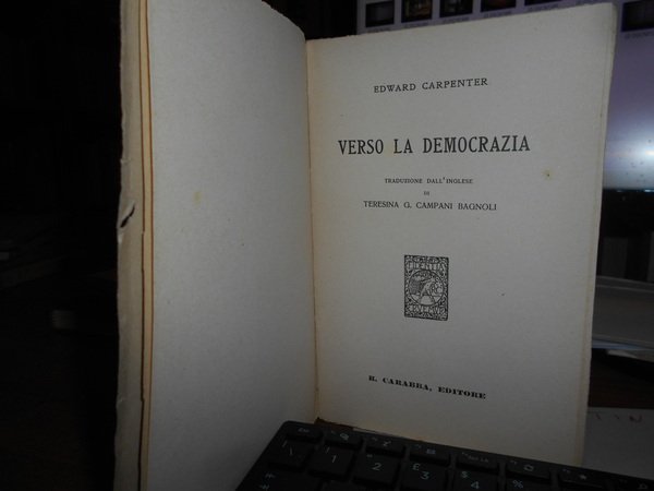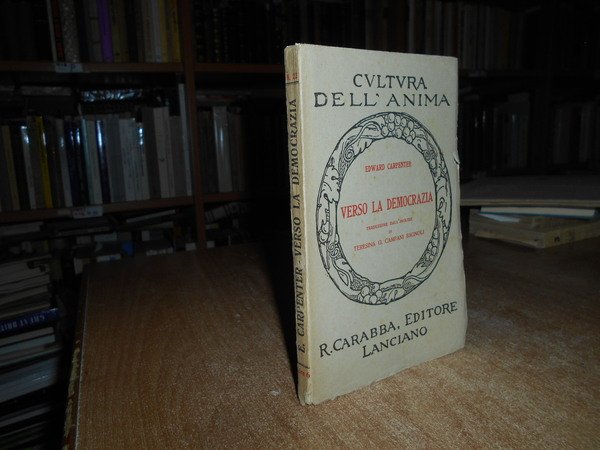 EDWARD CARPENTER. Cultura dell' anima. VERSO LA DEMOCRAZIA. Lanciano, Carabba, 1938. In-16°, br. 125, (1) pp. Ben conservato (intonso) con alcune sottolineature in 2 pp. a matita colorata. Uff. scat. 1 Tin.