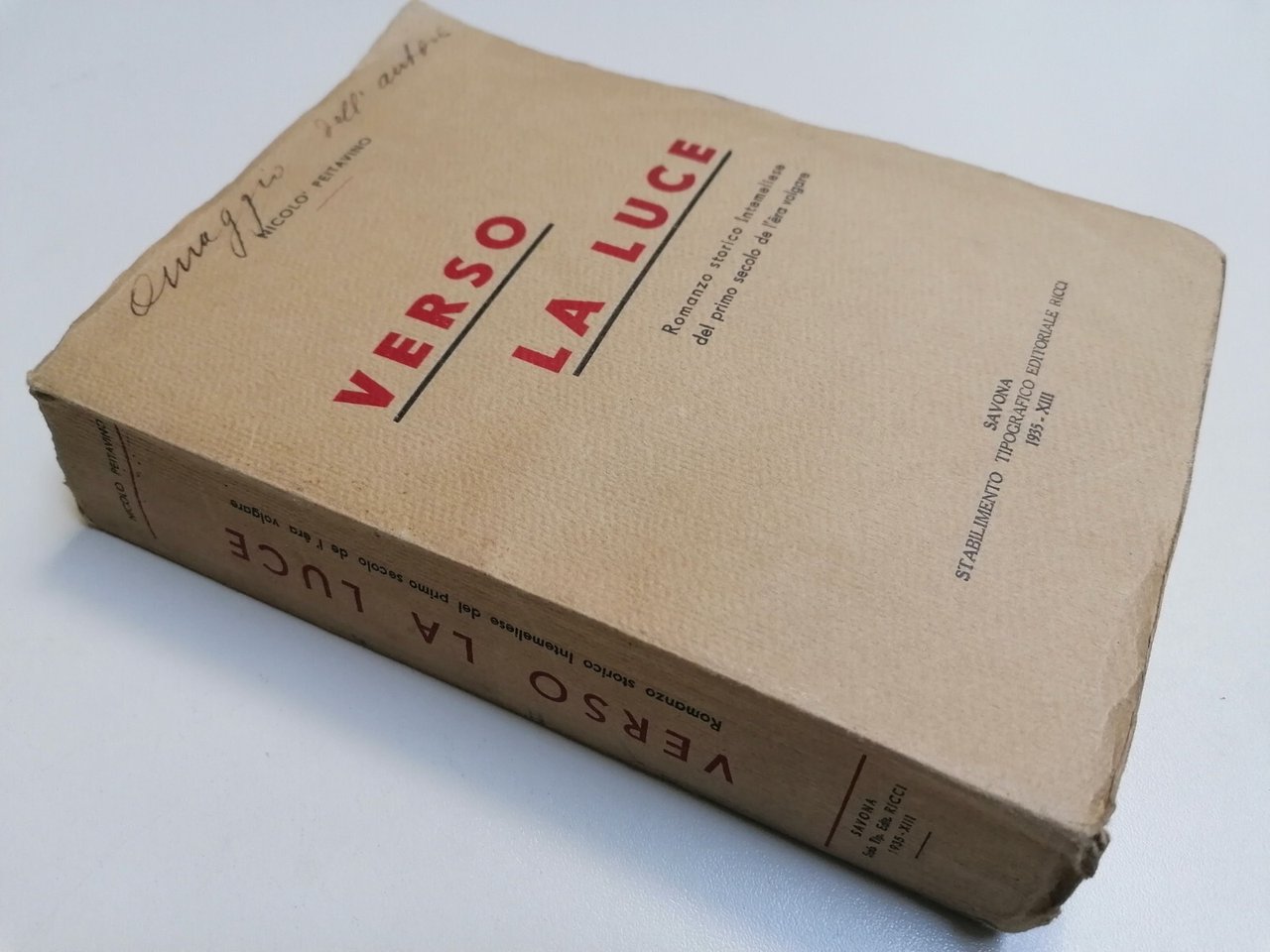 Savona, Ricci, 1935 Brossura, in 8^, 510 pp., con la dicitura autografa "omaggio dell'autore" Discrete condizioni generali compatibilmente con l'età