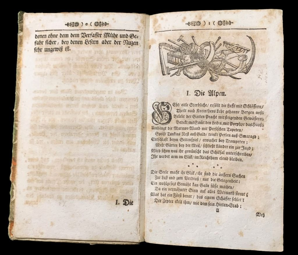 In 8° (18,5×11,4 cm); (2 antiporta figurata, incisa da J. Grimm che riproduce un paesaggio alpino svizzero ideale ispirato dallopera di Haller con il suonatore di corno delle Alpi riposato sotto un albero e le cime coperte dai ghiacciai, popolate solo da camosci), (10), (2 il ritratto di Haller inciso da Isaak von Steiger e David Herrliberger), 114, (2 b.), 24, (2) pp. Tutte le copie censite che abbiamo potuto visionare, differiscono dal nostro esemplare per il numero di pagine. Xilografia animata al frontespizio. Testatine e finalini, alcuni animati. Bellissima ed elegante legatura coeva in cartoncino rigido foderato con magnifica carta a motivi floreali in oro e con coloritura a mano in rosso e toni verdi, qualche lieve strappetto e segno del tempo ma nel complesso in buone condizioni di conservazioneTagli spruzzati in rosso. Alla prima carta bianca antica nota di proprietà settecentesca Sol. Wolphij, 1736, Nunc Conradi Suizeri V. D. M.. Ritratto di Haller inciso di Isaak von Steiger da David Herrliberger. Allultima carta bianca, in bellissima grafia antica, una nota bibliografica ed un componimento poetico. Haller finanziò in anticipo la stampa di questa seconda edizione. Nel 1736 commissionò altre due stampe di questa edizione speculando, probabilmente, sul crescente successo del volume e sullaumento di richieste dello stesso, non a caso, mantenendo, sul frontespizio, la data del 1734 anche per ledizione del 1736 che però vede aggiunte, prima dellultima carta di errata, altri componimenti. Ledizione in nostro possesso dovrebbe essere la prima stampa della seconda edizione vera e propria, notevolmente aumentata rispetto alla prima edizione del 1732. Anche di questa edizione, come della prima, vennero tirate pochissime copie. Una delle seconde tirature della prima edizione vide le 138 pagine di testo numerate con numerazione susseguente e non come nel nostro esemplare con il famoso distacco fra le 114 pagine e le 24 pagine stampate secondo la tradizione bibliografica, a parte. Fra gli esemplari della seconda edizione stampati con nel 1734 vi sono variazione nelle pagine non numerate poste allinizio ed alla fine del volume ma solitamente, queste differenze sono dovute al fatto di come sono rilegate queste pagine e a come sono valutate le tavole fuori testo, alcune volte contate in numerazione ed altre no. Sembra che in questa edizione, il componimento Sullorigine del male presente dopo pagina 114, sia stato stampato singolarmente a Berna ma che questa parte venne tirata con un tale numero di errori che Haller fu costretto a correggere il testo a mano allegando un foglio a parte, alla fine delle copie. Allinizio del componimento Sullorigine del male è presente una bella testatina animata con una bella veduta di una cascata. Allinterno delle ultime 24 pagine con numerazione a se, sono presenti numerose note a matita a lato del testo, nellultima carta, come già detto, a china, una nota bibliografica antica ed un componimento poetico in ultima facciata, in lingua tedesca. Albrecht von Haller (Berna, 16 ottobre 1708 Berna, 12 dicembre 1777) fu uno dei medici più famosi dei suoi tempi ma fu anche un apprezzato poeta. Studiò medicina a Tubingia prima e poi a Leida dove si laureò nel 1727 e fra i suoi colleghi di studio ebbe Johann Christoph Bohl. Grande appassionato di montagna, nel 1728 compì un lungo viaggio attraverso le Alpi insieme al suo amico connazionale e famoso medico e naturalista, Johannes Gessner, durante il quale approfondì due delle sue passioni più grandi la poesia e la botanica. Nel 1729 è a Basilea dove segue i corsi di matematica del grande matematico Johann Bernoulli. Lo stesso anno ritorna a Berna dove istituisce il teatro anatomico cittadino. Nel 1732 pubblicò la sua opera poetica più importante, appunto, i suoi Versuch von Schweizerischen nei quali descrive gli ambienti bucolici montani da lui visitati elogiando la vita vissuta in montagna e contrapponendola ai corrotti costumi cittadini arrivando alla sicurezza che solo nella natura alpina si può veramente vedere lopera divina. La sua carriera medica proseguì poi a Gottinga fino al 1753 dove fondò listituto danatomia ed il giardino botanico. In seguito si trasferì a Berna dove assunse la carica di intendente del palazzo comunale prima e poi di direttore delle saline e vicebalivo di Aigle. Nel 1764 acquistò il feudo di Goumoens-le-Jux. Il suo nome è legato a diverse scoperte in campo medico ma apprezzatissime, sono ancora oggi, i suoi componimenti dedicati alla montagna. Opera assai rara, in bellissima legatura coeva ed in buone-ottime condizioni di conservazione. Rif. Bibl.: Biblioteca di Monaco, esemplare digitalizzato; Lonchamp 1376; Spiess-Schaad 4.10 (Porträt Steigers) und 7.7 (Frontispiz); vgl. Lundsgaard-Hansen 551 und 552 che descrive due edizioni con numero di pagine differenti; Bibliotheca Halleriana 29 che specifica di come si tratti della prima stampa della seconda edizione, notevolmente aumentata rispetto alla prima edizione del 1732; WG 599,2; Goed. IV/I,24,2b.