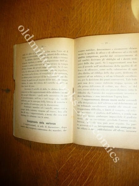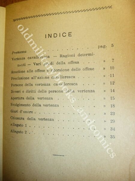 "DESCRIZIONE: Soc. Tip. Modenese Modena 1940 br. ed. pp. 35 in 16°. Un curioso volumetto edito dall'Accademia di Fanteria e Cavalleria nel quale si esaminano le vertenze cavalleresche secondo i gradi di offesa. Doveri e diritti dell'offeso, apertura della vertenza, giurì d'onore, chiusura della vertenza. In allegato due esempi di lettera di "mandato" e di richiesta di "soddisfazione". CONDIZIONI: Discrete, vol. con mancanze alla cop. e stesse al retro. PESO / WEIGHT: 100 gr. without package"