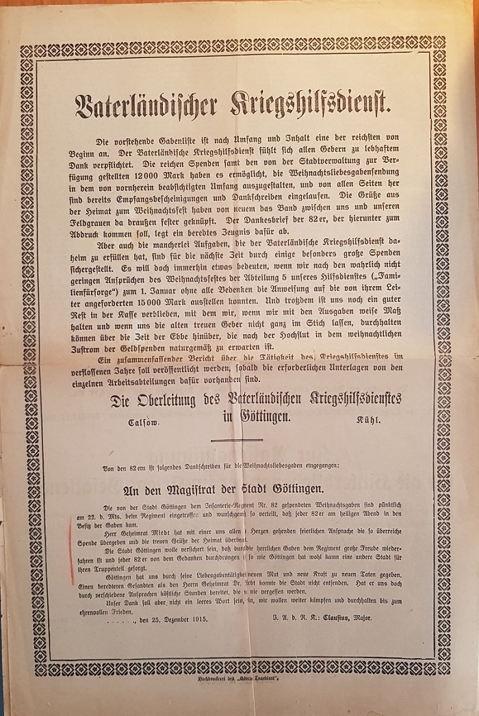 Die historische Beilage zur "Göttinger Zeitung" vom Weihnachtsfest 1915 verzeichnet zunächst auf etwa 2,5 Seiten die Spenden aus der Bevölkerung für den Vaterländischen Kriegshilfsdienst. Hier ist dicht geschrieben und genau verzeichnet, wer mit welcher Summe und aus welchem Beruf heraus gespendet hat - aufgeteilt nach den jeweiligen Zahlstellen in Göttingen (Stadtkämmerei, Weinhandlung Bremer, Zigarrenhandlung Krausbauer etc.). Infolge werden kurz die bisherigen Spenden zur "Nationalstiftung für die Hinterbliebenen der im Kriege Gefallenen" aufgelistet (Datum 24.12.1915). Auf der vierten Seite ist ein längerer Text des Kriegshilfsdienstes selbst zu lesen - über aktuelle Vorgänge und Erreichtes sowie zu kommenden Aufgaben, denn der Krieg währte ab Dezember 1915 ja noch weitere zweieinhalb Jahre. Sehr interessant ist eine fast halbseitige Danksagung des Infanterie-Regiments Nr. 82 (die sogenannten "82er") an den Magistrat der Stadt Göttingen für die zum Weihnachtsfest 1915 übersandten Gaben. Hier heißt es: "Göttingen hat uns durch seine Liebesgabentätigkeit neuen Mut und neue Kraft zu neuen Taten gegeben", zuvor bereits ist zu lesen: "Die Stadt Göttingen wolle versichert sein, daß durch die herrlichen Gaben dem Regiment große Freude wiederfahren ist und jeder 82er von dem Gedanken durchdrungen ist, so wie Göttingen hat wohl kaum eine andere Stadt für ihren Truppenteil gesorgt". Seltene Archivalie aus dem Ersten Weltkrieg! - - - ACHTUNG! Dieses Buch kann wegen seines Gewichts oder seiner Größe nur als PAKET verschickt werden. Innerhalb Deutschlands 5,80 Euro. (Portokosten ins Ausland bitte erfragen.) / ATTENTION! Due to its weight or size this book can only be sent as a PARCEL. Within Germany 5,80 Euro (For shipment abroad please ask.)