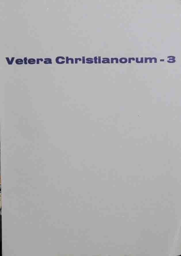 Vetera Christianorum, n.3, Istituto di Letteratura Cristiana Antica – Università degli Studi, Bari 1966, pp. 256, 10 c. di tavv. f.t. il. b.n., cm 26, br. ed. Sommario: A. Quaquarelli, La prosa d’arte di S. Colombano – G. Lomiento, La Bibbia nella compositio di S. Colombano – V. Recchia, Verginità e martirio nei colores di S. Girolamo – V. Loi, Influssi dell’esegesi biblica nello sviluppo del termine contritio – M. Mees, Matthaüs 5, 1-26 in den altlateinischen Bibelübersetzungen. Emendare und traducere in ihrem Einfluss – N. Pavoncello, I trattati minori del Talmud – M. Simonetti, Eracleone e Origene – F. Vattioni, Saggio sulla Volgata dei Proverbi – R. Gelsomino, L’Itinearium Burdigalense e la Puglia – A. M. Ariano, Complessi funerari presso l’antica Merinum. Lievi segni del tempo, per il resto ben conservato.