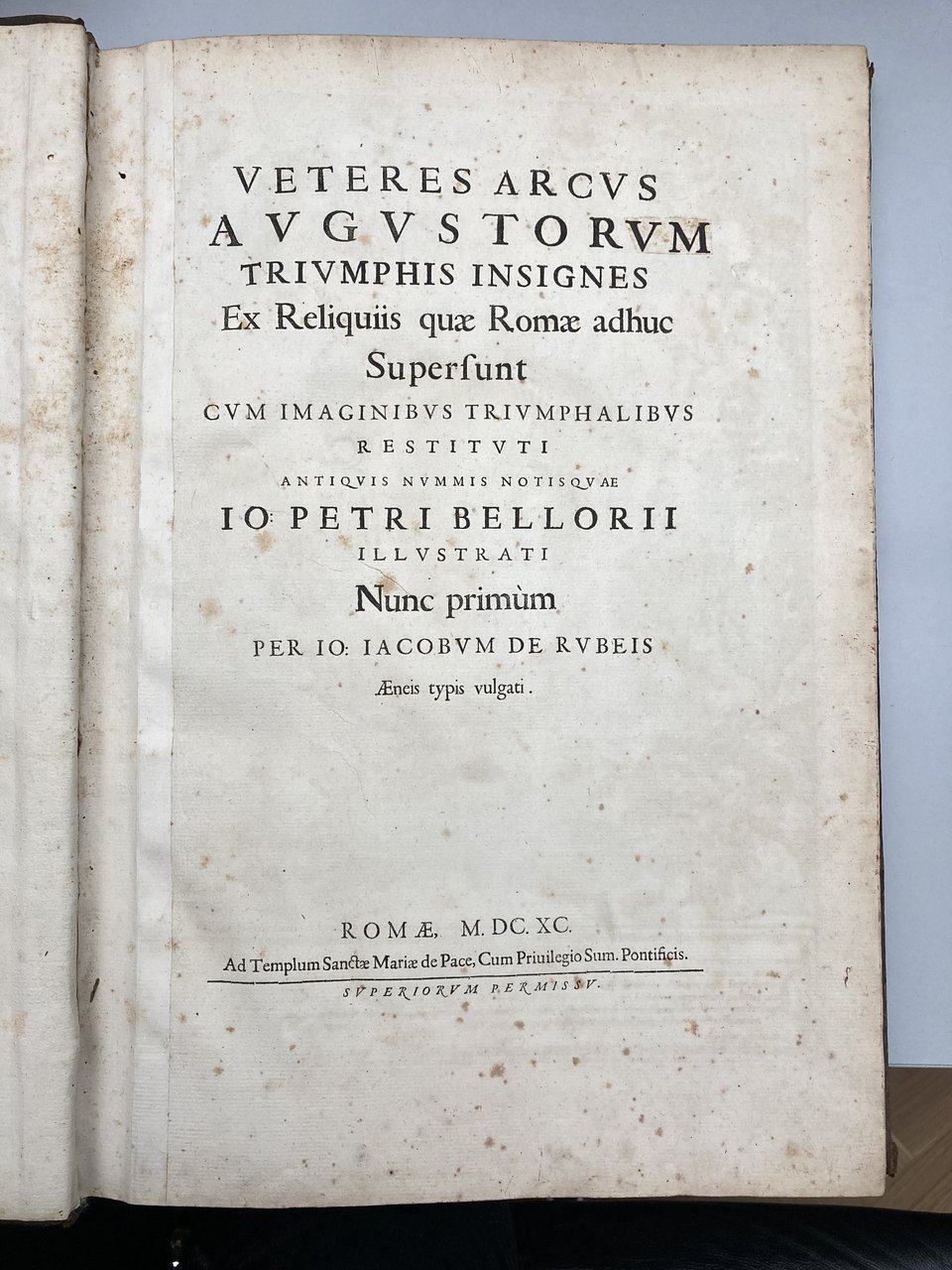 VETERES ARCUS AUGUSTORUM THIUMPHIS INSIGNES EX RELIQUIIS QUAE ROMAE ADHUC SUPERSUNT CUM IMAGINIBUS TRIUMPHALISBUS RESTITUTI ANTIQUIS NUMMIS NOTISQUE ILLUSTRATI.