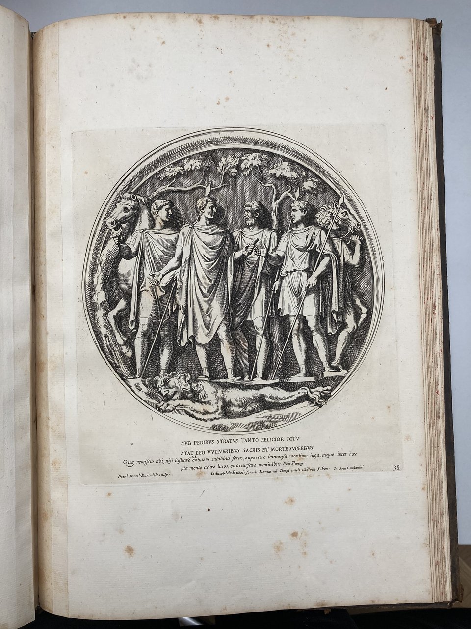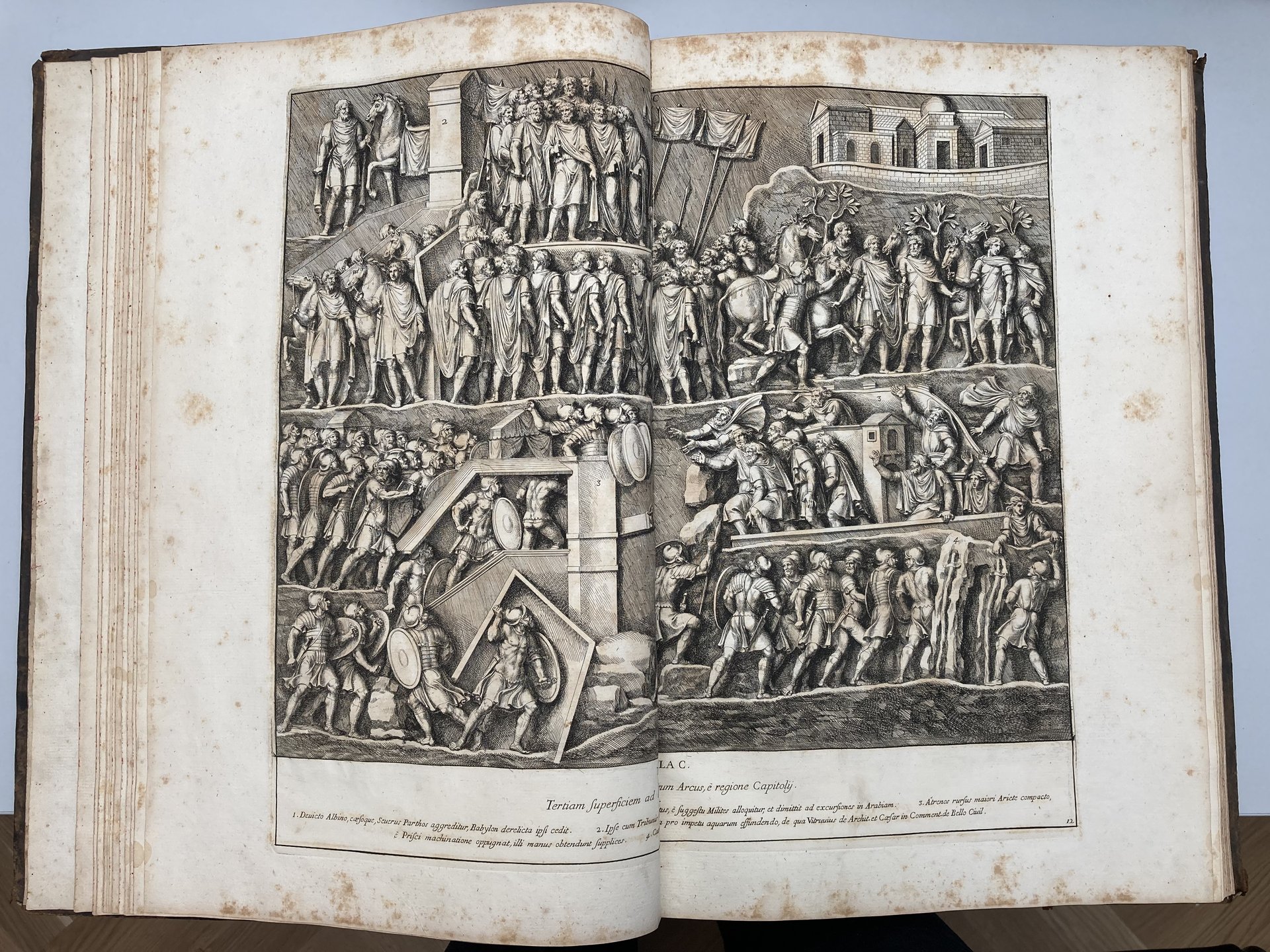 Prima edizione. Bellori, teorico e storico dell’Arte fu curatore ed antiquario delle collezioni di papa Clemente X e della regina Cristina di Svezia, noché segretario dell'Accademia di San Luca. Nel campo archeologico è degna di nota la pubblicazione, che egli scrisse insieme all’incisore romano Pietro Santi Bartoli, Admiranda romanarum antiquitatum ac veteris sculpturae vestigia (Roma 1693). Con la collaborazione di Bartoli, Bellori realizzò anche numerosi volumi di riproduzioni commentate di pitture e monumenti romani. Le tavole mostrano ricostruzioni degli archi o dettagli delle loro sculture in rilievo. First edition. Bellori, art theorist and historian, was curator and antiquarian of the collections of Pope Clement X and Queen Christina of Sweden, as well as secretary of the Academy of Saint Luke. In the archaeological field it is worth mentioning the publication, which he wrote together with the Roman engraver Pietro Santi Bartoli, Admiranda romanarum antiquitatum ac veteris sculpturae vestigia (Rome 1693). With the collaboration of Bartoli, Bellori also produced numerous volumes of reproductions and commentary of Roman paintings and monuments.