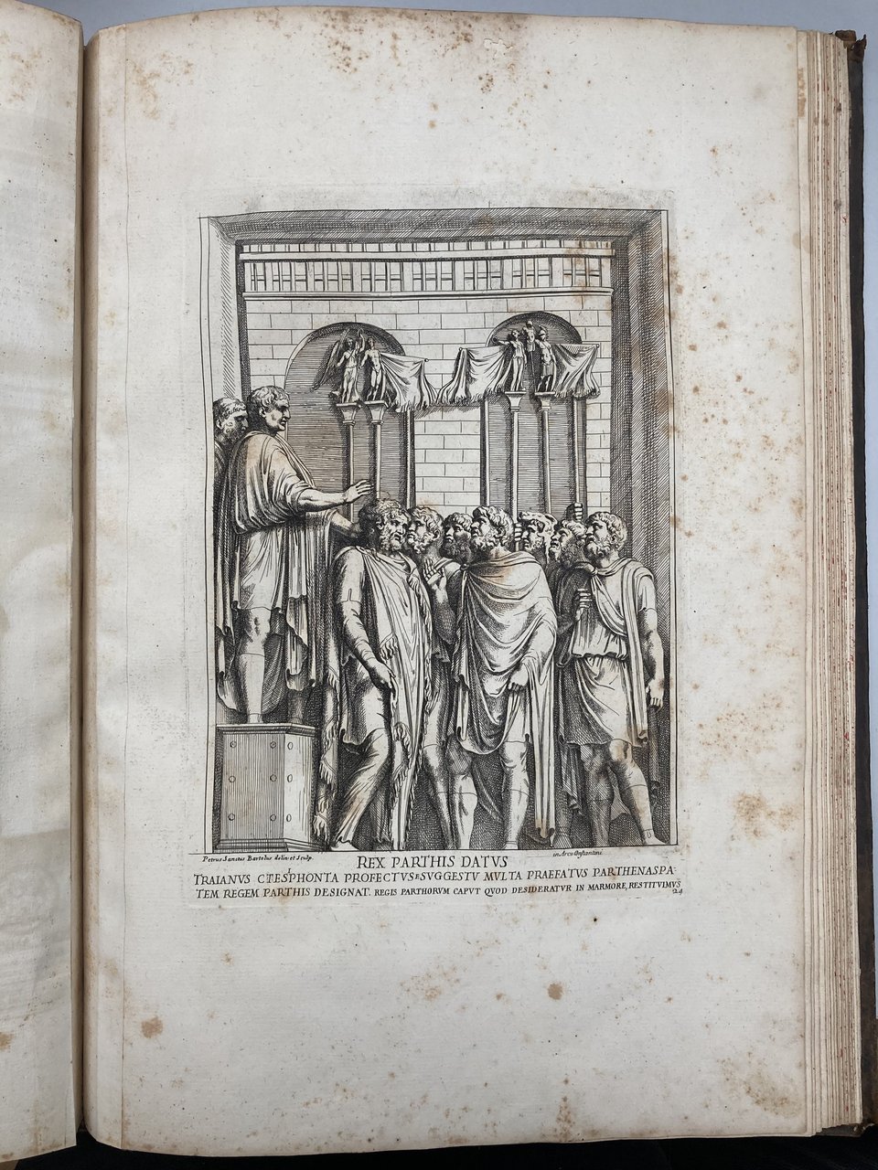 Grande folio (490 x 320 mm), frontespizio, 52 cc. (incl. 5 carte di testo e 47 fogli con 49 tavole). Le tavole includono un ritratto calcografico del dedicatario dell'opera Cardinal Pietro Ottoboni, pro-nipote del papa Alessandro VIII disegnato da Pietro Lucatelli, 29 tavole disegnate e incise da Pietro Sancti Bartoli (4-8, 24- 45, 49, 50). Leggere fioriture, normalmente non prossime alle incisioni; legatura in piena pelle coeva con minori difetti alle cuffie e agli angoli.