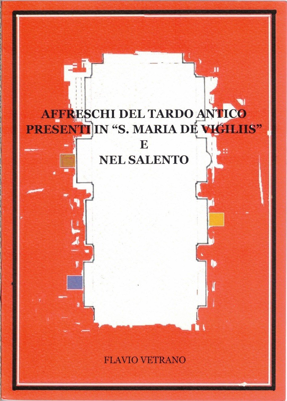 Flavio Vetrano, Affreschi del Tardo Antico presenti in S. Maria de Virgiliis e nel Salento, s.n., s.l. (ma stampato a Veglie, presso la Tipografia Serigrafia Arti Grafiche) 2005, pp. 100, ill. b.n. e col., cm 24, br. ed. All’occhiello: Gruppo Otto srl, Veglie. Indice: Introduzione – Chiesa Santa Maria de Virgiliis annessa al convento dei minori conventuali noto come S. M. della Favana (Dati storici artistici culturali della chiesa conventuale di S. M. de Virgiliis – Analisi strutturale della Chiesa di S. M. deVirgiliis) – Affreschi del tardo antico presenti nella chiesa di S. M. de Virgiliis (Affresco Madonna con Bambino – Affresco coperto da ciborio – Analisi degli elementi che compongono la figura del Cristo morto – Deduzioni pittoriche culturali dell’affresco il Cristo morto) – Confronto tra gli affreschi siti a Vegliecon altri del territorio salentino (Affreschi della cripta della Favana e analogie con il Cristo morto – Analogie tra gli affreschi di Veglie ed altri del territorio salentino – Galatina – Nardò – Soleto – Galugnano – Otranto – Sternatia – Oria – Documenti) – Pitture nelle edicole urbane a Veglie (Madonna Addolorata – Madonna Immacolata – Carlo Lupo – Prima pittura – Seconda pittura – Forma delle nicchie) – Bibliografia. Perfetto.