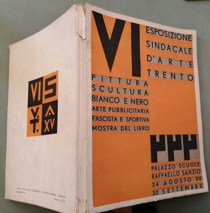 76, [4], [8] p., [28] p. di tav., 20 cm, bross. Condizioni : USATO - Stato : Buono, ordinari segni d'uso e del tempo, 2 piccoli difetti al dorso. Altre note : Mostra del settembre 1937 tenutasi al Palazzo Scuole Raffaello Sanzio. Segretario del Sindacato interprovinciale tridentino è Depero, che cura buona parte della mostra e del catalogo, firmando l’introduzione/manifesto e due delle notizie sulle mostre retrospettive. Inaugura in questa edizione il premio Caproni «Ala fascista». Una trentina di belle riproduzioni b.n. di opere (tra le quali ‘Plastico Campari’ e ‘La polenta’ di Depero, e ‘Ala fascista’ di Iras Baldessari. Raro e ben conservato.