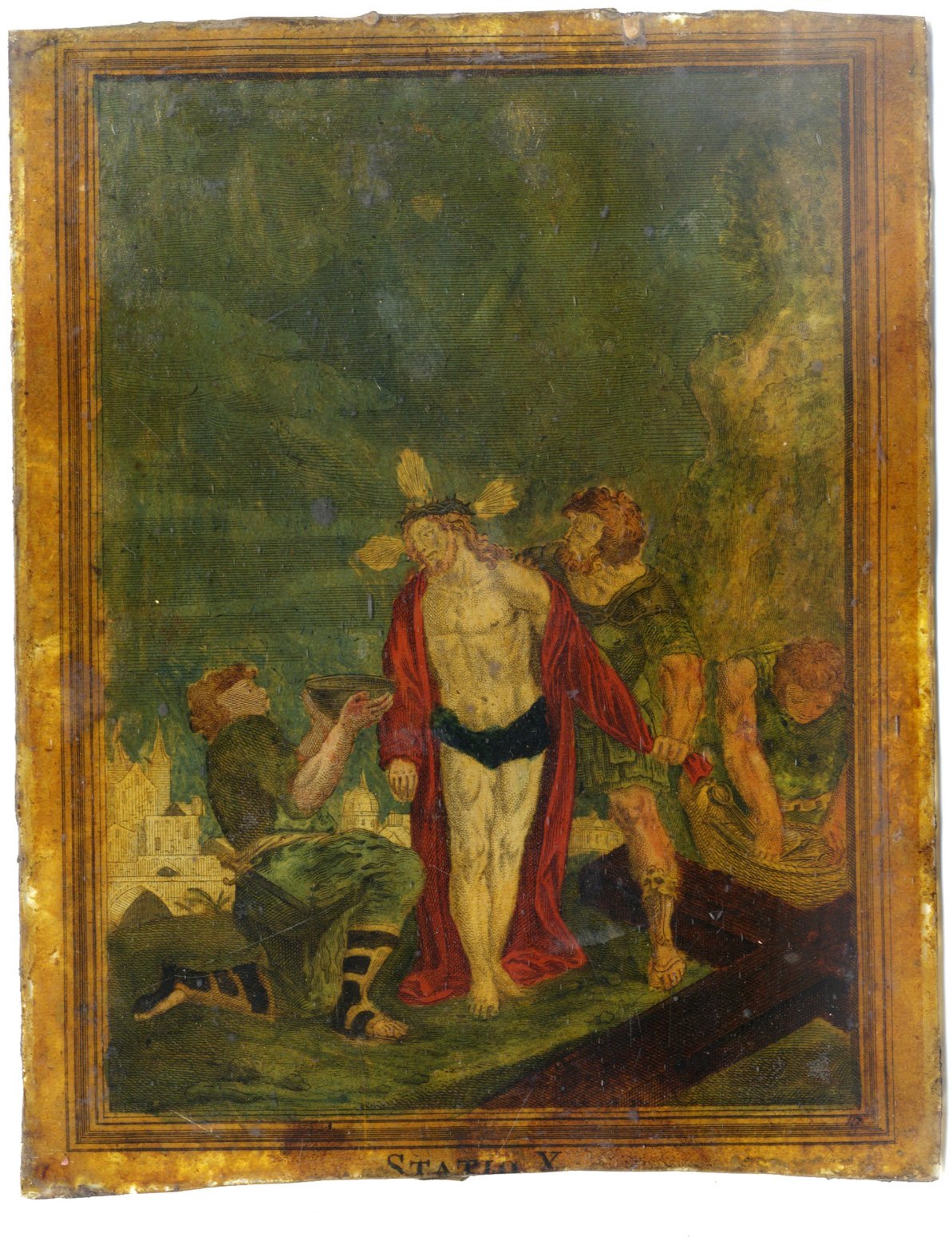 >Incisione in rame, mm 270x204 ca., applicata all'epoca al verso di un vetro soffiato. La colorazione effettuata sul retro della stampa garantisce un notevole effetto cromatico nella trasparenza; di notevole rarità per l'estrema deperibilità del materiale utilizzato. In considerazione del costo e della difficoltà delle pitture su vetro e delle lacche su legno, si diffuse l'utilizzo di incisioni remondiniane per ornare mobili e specchiere, trovando accoglienza anche negli arredi delle più blasonate aristocrazie veneziane. La vasta produzione di Bassano era idonea a diversificarsi nei soggetti e nei modi in ragione della diversa destinazione. Cfr. G. Ericani, ''Stampe per lacca povera'' in ''Remondini. Un editore del Settecento'', p. 222: ''Nel vetro, l'uso di sostituire la decorazione dipinta con un'incisione è antico e diffuso principalmente in area lombardo-piemontese e veneziana. Particolare importanza assume la prassi tra Quattro e Cinquecento, quando numerose incisioni raffaellesche vengono applicate su vetro e colorate... la notevole deperibilità di tali oggetti... induce a ritenere che l'economicità dell'esecuzione non sia stato il fattore preponderante per la diffusione della moda, ma la moda stessa ne abbia creato il bisogno''.