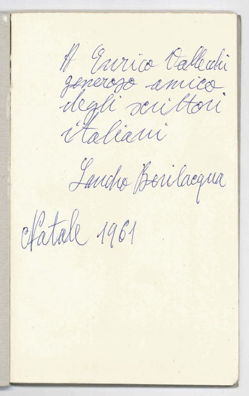 LIBROPrima edizione.CON AUTOGRAFO.Eccellente esemplare pregiato da bella dedica autografa dell’autore all’editore Enrico Vallecchi, «generoso amico degli scrittori italiani . Natale 1961».Raccolta di poesie religiose del poeta Sandro Bevilacqua, oggi dimenticato ma negli anni ’50 accostato a nomi rilevanti della poesia dell’immediato dopoguerra.