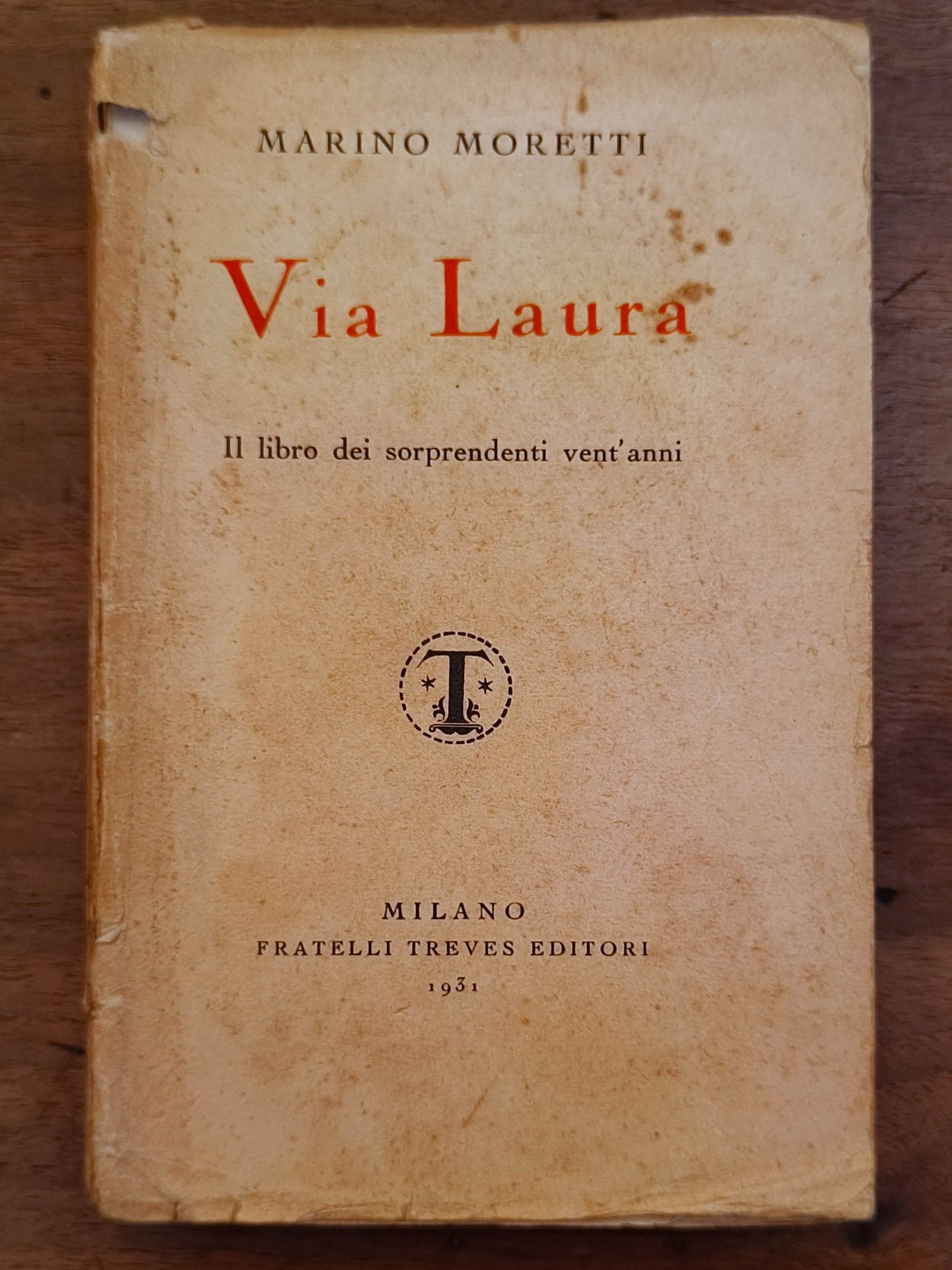 Via Laura. Il libro dei sorprendenti vent'anni, Milano, Fratelli Treves Editori, 1931. Prima edizione. Cm 18,7. Pp. XI 343. Brossura editoriale con segni d'usura. Lacuna in basso al dorso, qualche strappo.