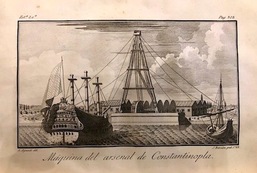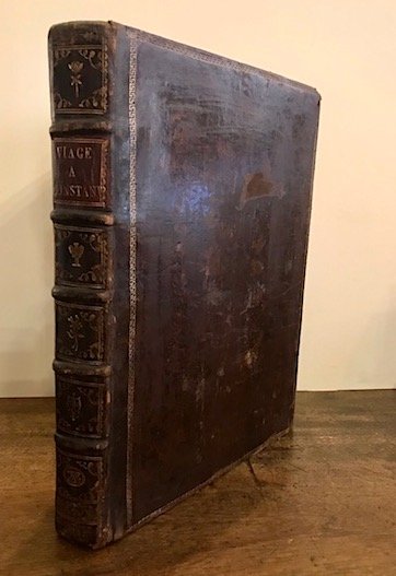 Folio (cm. 29,5), 8 cc.nn., 360-XXXIII pp. Con una carta geografica ripiegata e 24 tavv. calcografiche f.t. Vignetta al frontespizio, iniziali, testatine e fregi xilografici n.t. Legatura coeva in piena pelle con nervi, ricchi fregi e titolo oro impresso al ds. (piccole abrasioni ai piatti e lievi tracce d’usura). Cornici dorate ai piatti. Carte di guardia marmorizzate. Prime pagine leggermente ondulate e circa la metà delle tavole piuttosto brunite, altrimenti esemplare in più che buono stato di conservazione. Prima rara edizione di questa importante relazione della spedizione navale a Costantinopoli per la firma del trattato di pace tra Spagna e Impero Ottomano. L’Autore - che non prese parte alla missione - compilò l’opera sul manoscritto di Don Gabriel de Aristizabal, comandante della spedizione. La seconda Appendice contiene il resoconto del viaggio a Cipro nel 1788. Atabey, 835; Blackmer, 1152; Palau VII, p. 164.
