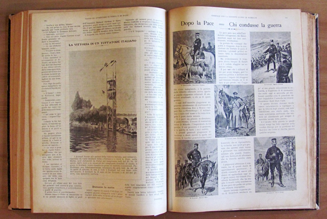 Giornale per la Gioventù e per le Famiglie. Anno II - N.40/91 - Gennaio-Dicembre 1905. Illustrazioni monocromatiche in tutte le copertine e in b/n n.t. in tutti i fascicoli. Contiene tra i tanti racconti anche Le avventure di Robinson Crosoè. Rilegatura coeva cartonata con dorso in pelle con titoli in oro. Lievissimi segni del tempo in qualche pagina. Interno comunque in Ottimo Stato. 25x33; pag. da 330 a 894. Rarissimo e in Ottimo stato. , Ottimo (Fine)