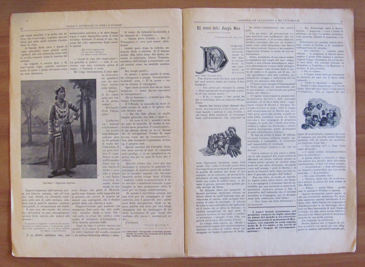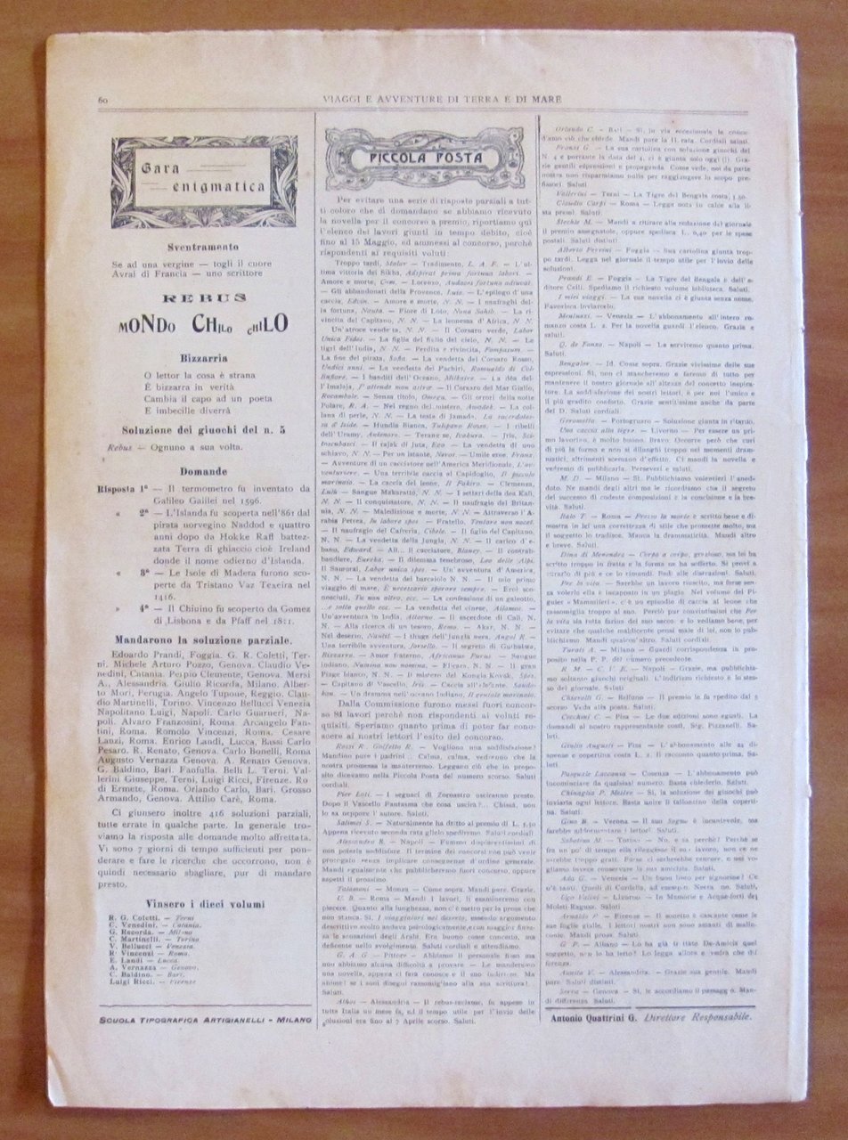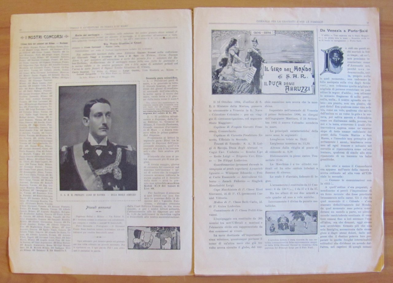 Viaggi e Avventure di Terra e di Mare - Anno I - N.7 del 19 Maggio 1904. La partenza da Venezia di S.A.R. il Principe Luigi di Savoia Duca degli Abruzzi per il viaggio di Circumnavigazione. Illustrazioni, anche fotografiche, in b/n n.t. a tutte le pagine, tutte dedicate al viaggio. Editrice Quattrini - Milano, 1904. Brossura editoriale. 24,5x35; pp.12. Raro e in Ottimo stato. , Ottimo (Fine)
