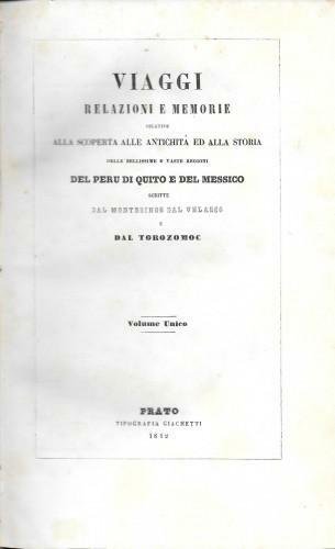 Viaggi, Relazioni e Memorie relative alla scoperta, alle antichità ed alla storia delle bellissime e vaste regioni del Perù, di Quito e del Messico scritte dal Montesinos, dal Velasco e dal Torozomoc