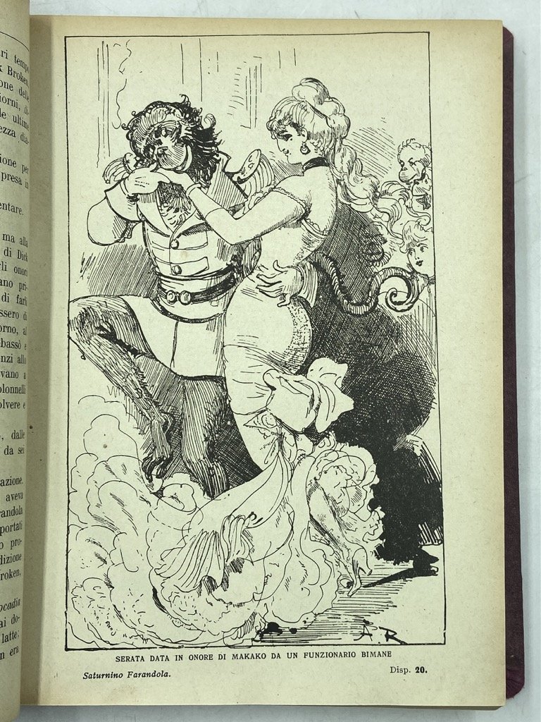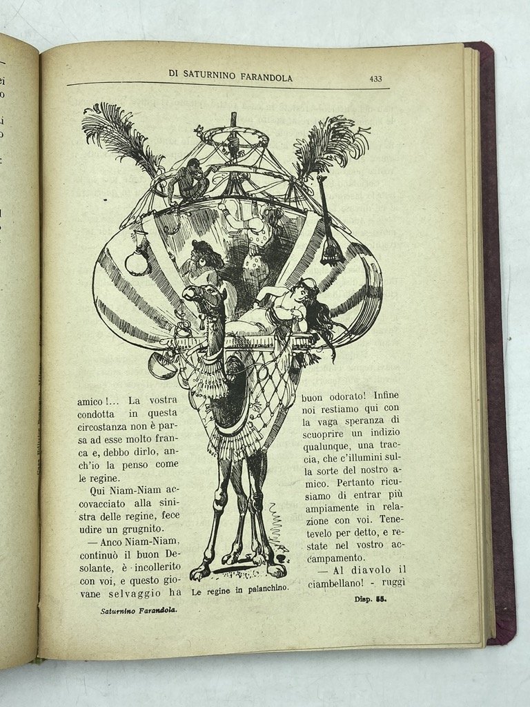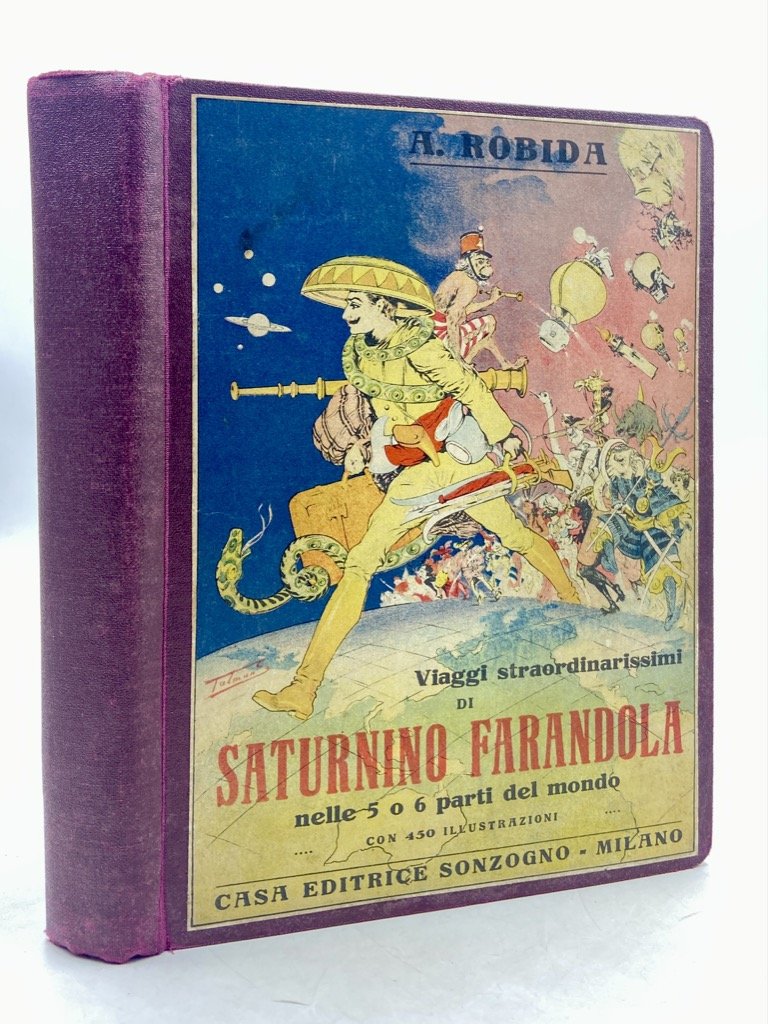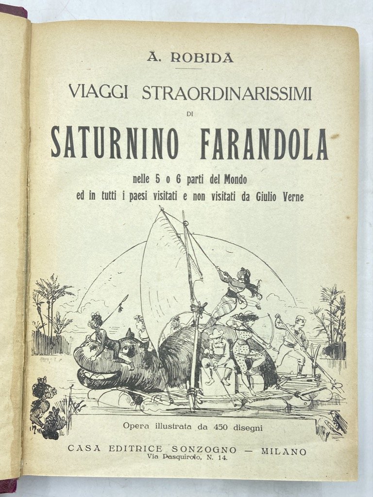 Legatura in tela con brossura illustrata applicata sul piatto anteriore, cm 23 x 17.5, pp 804, 450 illustrazioni in nero. Lievi segni del tempo sulla legatura, conservato il solo piatto anteriore della brossura che racchiudeva le dispense. Non presente la carta geografica ripiegata segnalata in altre edizioni ma in questa non prevista stando ad ICCU. Fantasioso romanzo scritto e illustrato da Albert Robida, visionario nelle sue anticipazioni del futuro come in questa rocambolesca narrazione d’avventura affine a quelle del celebre connazionale Jules Verne, omaggiato fin dal titolo. L’edizione originale francese apparve nel 1879 in cinque parti (Le Roi des singes, Le Tour du monde en plus de 80 jours, Les Quatre Reines, À la recherche de l’éléphant blanc, S. Exc. M. le Gouverneur du Pole Nord), raccolte in volume unico nel 1882; la prima edizione italiana, per Sonzogno nel 1884, fu come le successive dell'opera completa. Qui raccolta l'edizione a dispense che l'editore pubblicò attorno al 1919, con le 450 illustrazioni di Robida in nero, nel testo o a piena pagina.