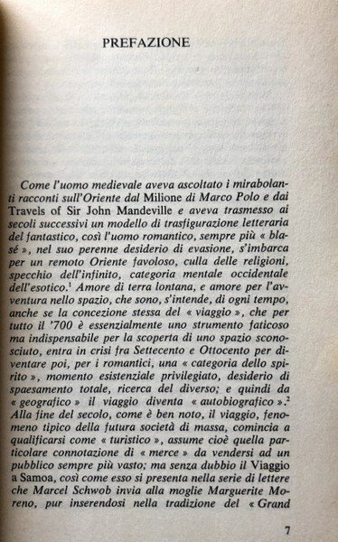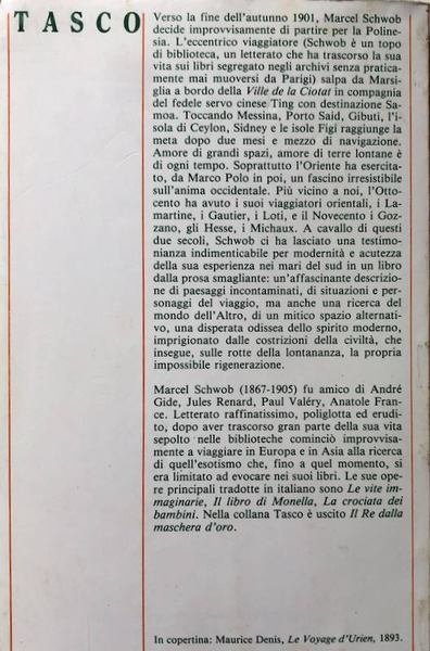 Verso la fine dell'autunno 1901, Marcel Schwob decide improvvisamente di partire per la Polinesia. L'eccentrico viaggiatore (Schwob è un topo di biblioteca, un letterato che ha trascorso la sua vita sui libri segregato negli archivi senza praticamente mai muoversi da Parigi) salpa da Marsiglia a bordo della Ville de la Ciotat in compagnia del fedele servo cinese Ting con destinazione Samoa. Toccando Messina, Porto Said, Gibuti, l'isola di Ceylon, Sidney e le isole Figi raggiunge la meta dopo due mesi e mezzo di navigazione. Amore di grandi spazi, amore di terre lontane è di ogni tempo. Soprattutto l'Oriente ha esercitato, da Marco Polo in poi, un fascino irresistibile sull'anima occidentale. Più vicino a noi, l'Ottocento ha avuto i suoi viaggiatori orientali, i Lamartine, i Gautier, i Loti, e il Novecento i Gozzano, gli Hesse, i Michaux. A cavallo di questi due secoli, Schwob ci ha lasciato una testimonianza indimenticabile per modernità e acutezza della sua esperienza nei mari del sud in un libro dalla prosa smagliante: un'affascinante descrizione di paesaggi incontaminati, di situazioni e personaggi del viaggio, ma anche una ricerca del mondo dell'Altro, di un mitico spazio alternativo, una disperata odissea dello spirito moderno, imprigionato dalle costrizioni della civiltà, che insegue, sulle rotte della lontananza, la propria impossibile rigenerazione.
