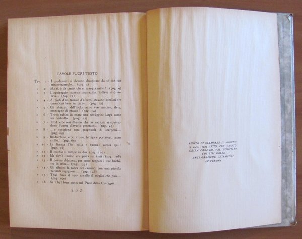 Illustrazioni in b/n n.t. di Gustavino e 16 tavole monocromatiche f.t. delle Piacevoli burle di Thyl sono di Nino Pagot. Editore Bompiani - Milano, I edizione 1934. Cartonato editoriale con dorso in tela originale con titolo in argento. Lievissime tracce del tempo alle copertine. Piccolo segno di penna al frontespizio e sul retro della pagina. Le ultime 15 pagine presentano una leggera ondulazione al margine alto e le sole pag. 218 e 219 hanno delle bruniture sulle ondulazioni stesse (come da foto). 17,5x25,5; pp.232. Raro, Buonissimo stato. , Molto buono (Very Good)