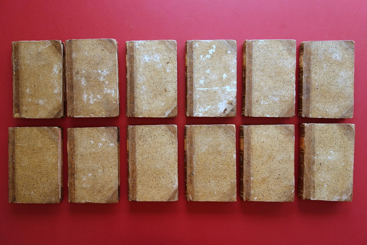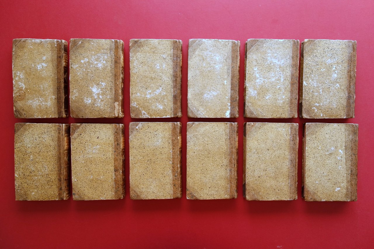 Settecentina, Jean Jacques Barthelemy, Viaggio d'Anacarsi il giovine nella Grecia verso la metà del quarto secolo avanti l'era volgare tradotto dal francese tomi 1-12 (opera completa in dodici tomi) Presso Antonio Zatta e Figli, Venezia 1791-93; cm 16,5x10,5; pp. circa 5000 complessive con 29 belle tavole incise in b/n fuori t., rip. più volte e con dettagli a colori (colorazione d'epoca a mano); legatura d'epoca in mezza pelle (dorso e angoli) con titolo e fregi impressi in oro al dorso, piatti marmorizzati, tagli colorati a spruzzo. Opera completa in 12 tomi, seppur mancante di due tavole (presenti 29 su 31 complessive; vedi foto e descrizione). Condizioni di conservazione Esemplare in buone condizioni con tracce d'uso e leggeri segni del tempo; coperte con alcune piccole abrasioni e qualche marginale mancanza ai margini e agli angoli dei piatti. Interni buoni con leggere bruniture. La prima carta del primo tomo, intitolata la Grecia e le sue isole", è stata erroneamente inserita al secondo volume. Poche carte con un piccolo strappetto al margine interno che non compromette l'immagine; ultima pagina, risguardo e contropiatto post. del volume 2 con pochi piccoli camminamenti da tarlo che non compromettono la lettura del testo. Prima traduzione italiana dell'immaginario viaggio in Grecia che il Barthelemy fece compiere a un altrettanto immaginario discendente del filosofo scita del VI secolo a. C., Anacarsi. Il viaggio, avvenuto ai tempi di Demostene, viene usato come cornice per una minuziosa ricostruzione storica e geografica della Grecia antica e classica. L'opera ebbe notevole diffusione per tutto il XIX secolo. Presenti 29 tavole sulle 31 totali; l'opera è quindi mancante di due tavole, le seguenti: "carta della palude meotide e del Ponto eusino"; "Platone sul capo Sunio in mezzo ai suoi discepoli". Opera completa di tutti i 12 tomi di testo,in bella legatura d'epoca in mezza pelle. SETT62.L19394 N "
