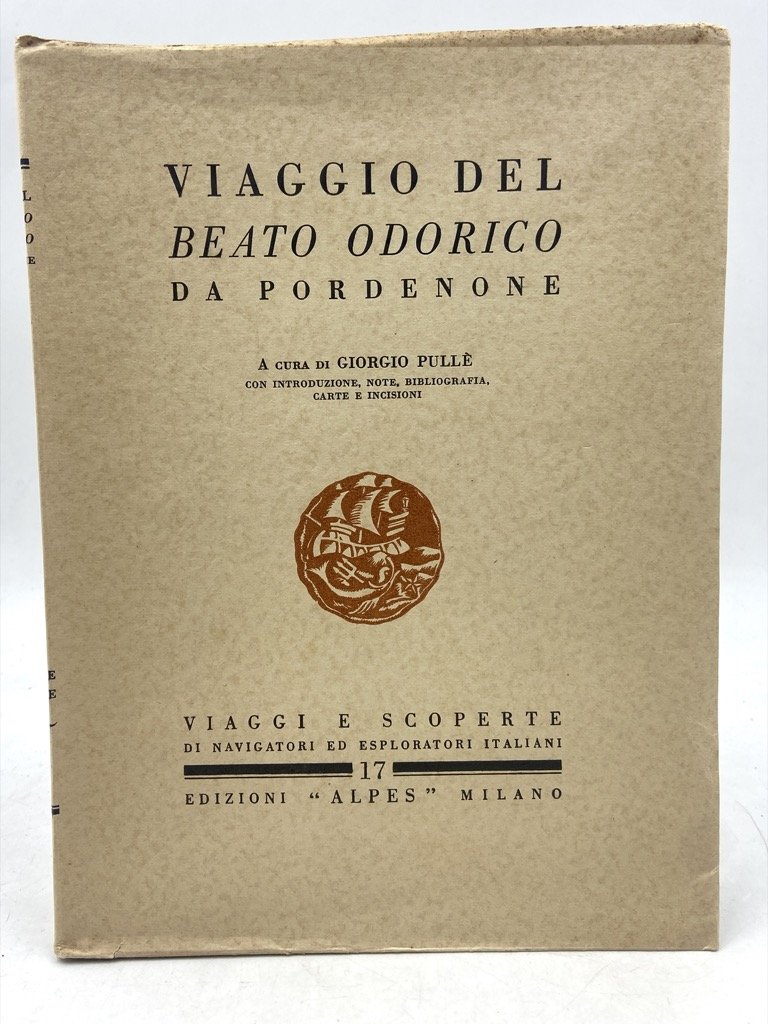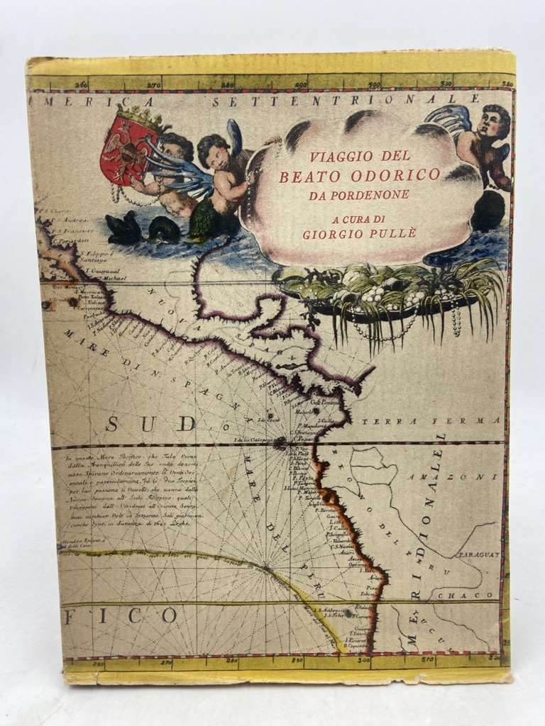 Brossura editoriale con sovraccoperta richiusa sui piatti e ulteriore sovraccoperta cartografica a colori, cm 21.5 x 16.5, pp 255 (5), tavole fuori testo in nero anche ripiegate. Ottimo esemplare a fogli chiusi. Edizione della Relazione del viaggio in Oriente dettata dal frate francescano Beato Odorico da Pordenone al confratello Guglielmo da Solagna nel 1330; il viaggio prese le mosse nel 1318 e portò Odorico (Pordenone 1286 circa - Udine 1331) a Pechino attraversando l’Asia Minore, l’India e Ceylon e, al ritorno, il Tibet. Cura e copiose annotazioni di Giorgio Pullè. Volume 17 della collana di Viaggi e scoperte di navigatori ed esploratori italiani curata da Rinaldo Caddeo.