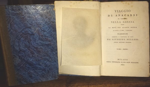 In-8 (16,5 cm) 14 voll in 7 tomi (1) c. (di ritratto in antiporta) 286 III c. (di incisioni acquarellate) (2) 3 (1), 319 IV c. (di incisioni acquarellate); 367 (1) IV c. (di incisioni acquarellate), 276 IV c. (di incisioni acquarellate); IV c. (di incisioni acquarellate) (1) c. (spiegazione) 319 (1), 313 II c. (di incisioni acquarellate) (3); (4) 322 III c. (di incisioni acquarellate) (2), 309 III c. (di incisioni acquarellate) (3); 333 IV c. (di incisioni acquarellate) (3), 308 III c. (di incisioni acquarellate) (2); 323 II c. (di incisioni acquarellate) (1), 302 II c. (di incisioni acquarellate) (2); 294 II c. (di incisioni acquarellate) (10), 355 (3). Mezza tele, piatti rivestiti di carta marmorizzata. Ex-libris R & A Papadopoli N 7766-7772 e "Classe V N 1092". Compagnoni Giuseppe o Belloni Giuseppe (1754-1833): abate, letterato, propose di adottare come bandiera quello che diventerà il tricolore italiano (1797), primo docente di un corso di diritto costituzionale (Ferrara, 1797). Nato a Lugo, Ravenna e morto a Milano. Barthélemy Jean Jacques (1716-1795)